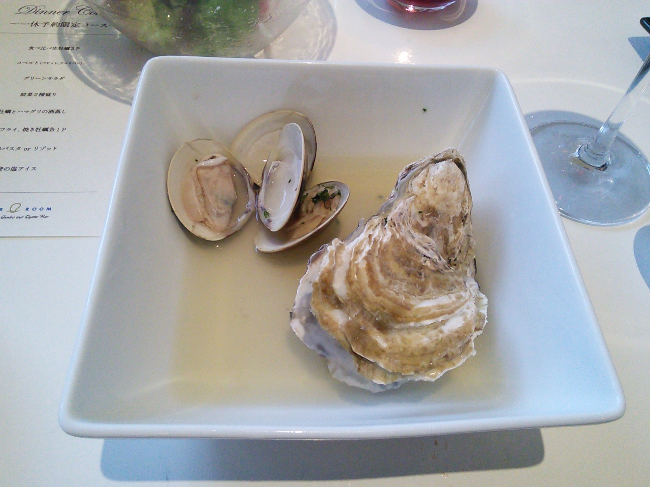アミューズ、生牡蠣3P、サラダ、前菜2種、牡蠣とハマグリの酒蒸し、カキフライと焼き牡蠣、パスタまたはリゾット、デザートという内容でした。