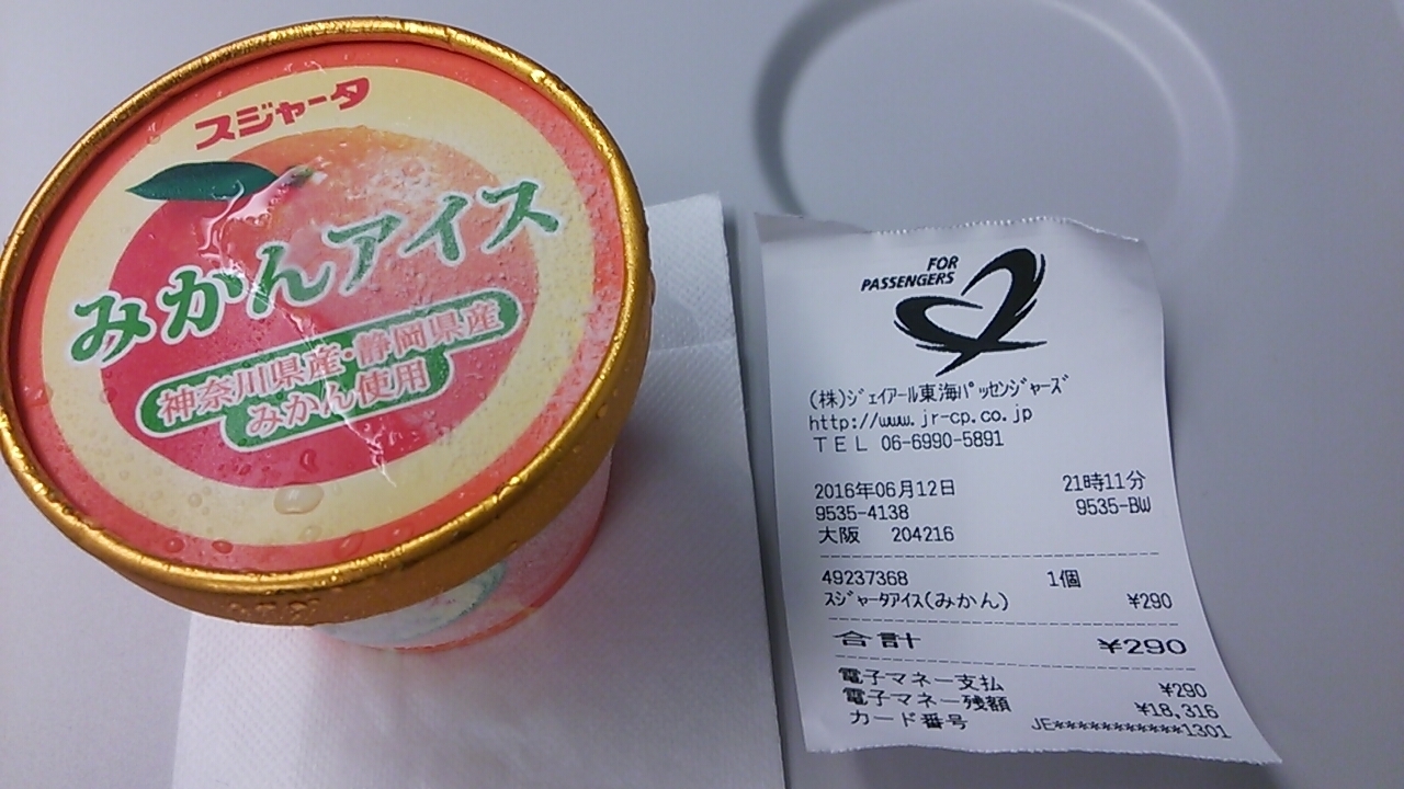 2016年6月12日の日曜日、東京20時33分発のひかり535号新大阪行きで東京から浜松まで移動したところ、みかん味のアイスクリームを販売していました。