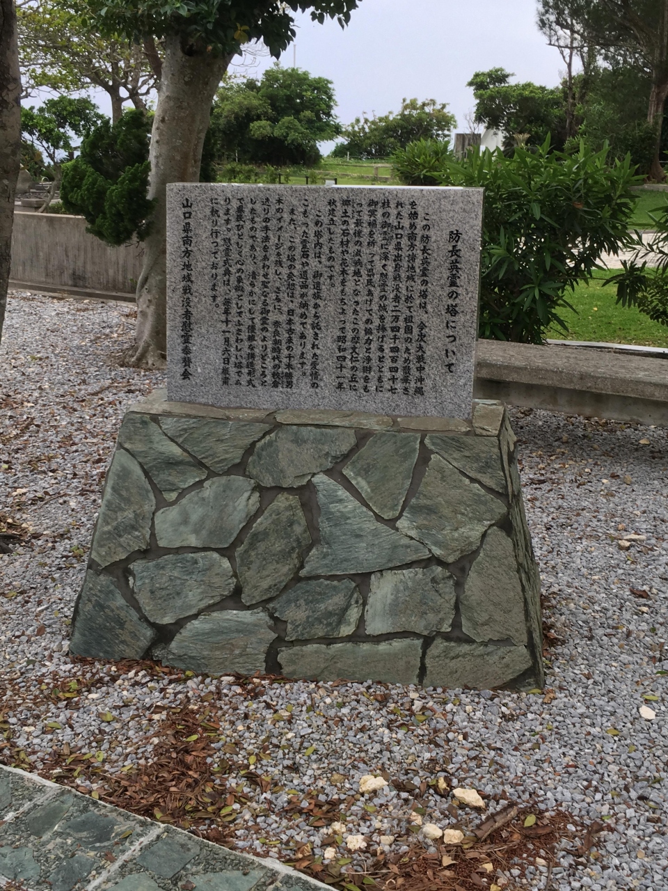 この防長英霊の塔には、細かな戦地の様子が書かれており、南方諸地域では?本土から補給が途絶え弾薬も尽き悪疫と闘いながら勇戦奮闘されて散華された?と。また沖縄戦では?本土防衛の第一線となり、昭和20年3月25日以降80余日にわたり凄惨苛烈な戦が続けられ、その結果沖縄の大半は焦土と化し、軍人軍属をはじめ一般住民の方々22万名(本県出身者1,043名)が尊い犠牲となられた?との碑文にありました。これは改修されたときに碑文を一部変えられたのだろうとは思います。沖縄戦に於いて沖縄県民の犠牲について記述しているものはないと聞いていたので。