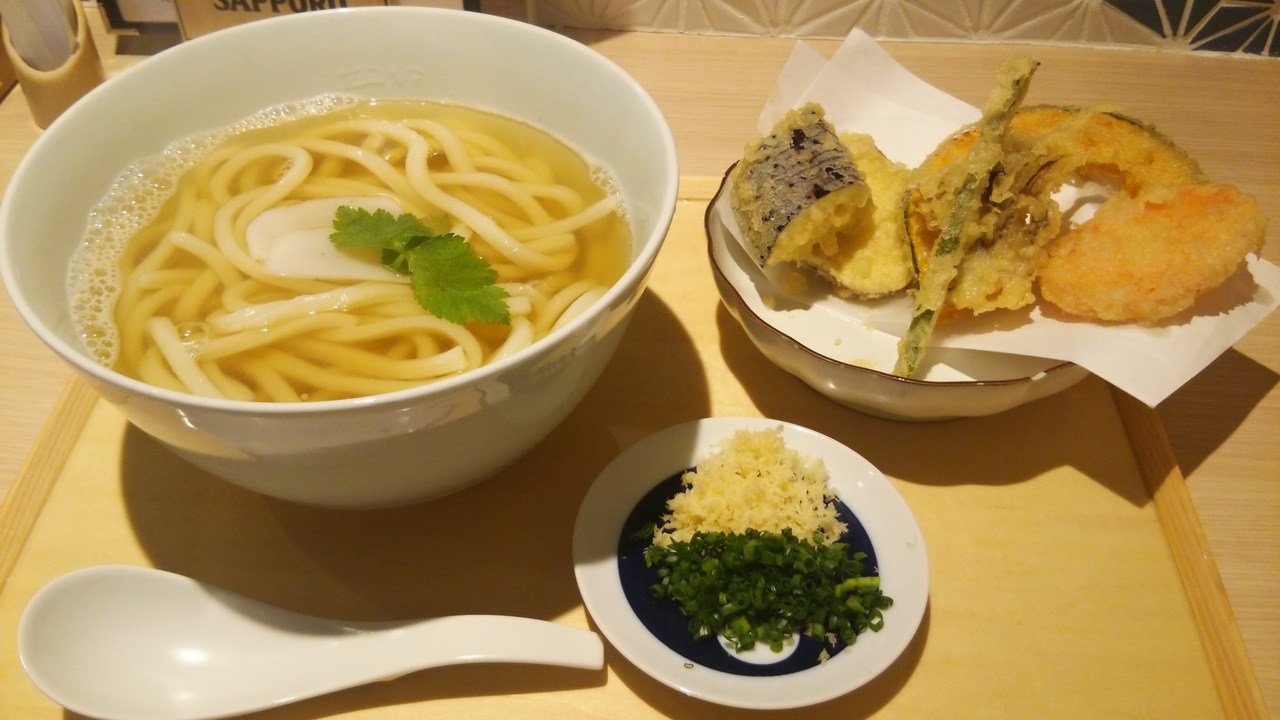 やわらかい麺が特徴の博多のうどんにあって、腰がある本格的な讃岐うどんが楽しめます。マンション二階にありますが、昼食どきには行列ができています。温かいうどんと冷たいうどんを選べ、付け合わせに揚げ物を追加します。ダシが大変美味しかったです。