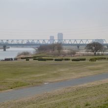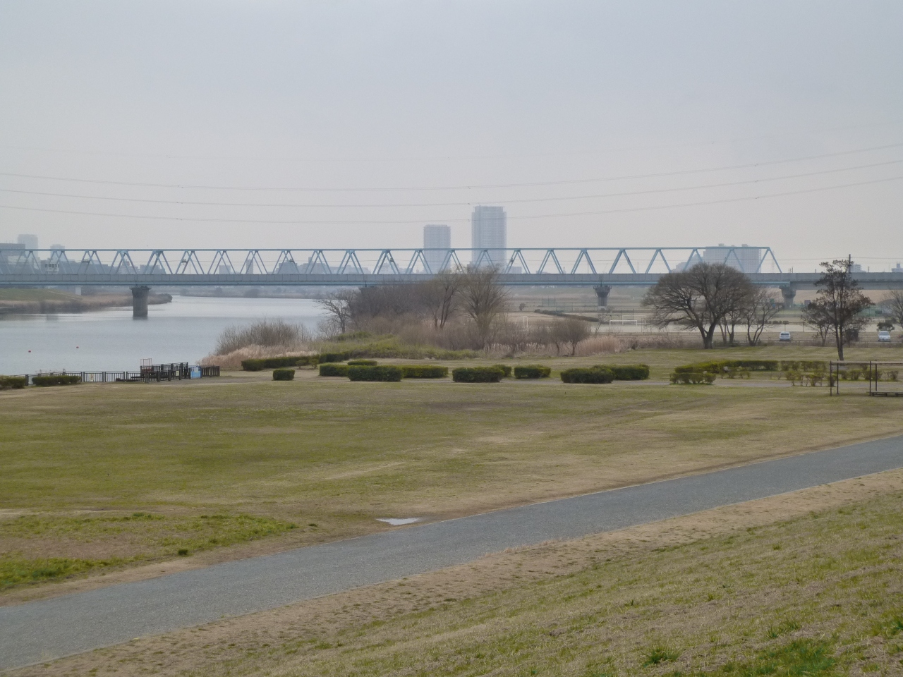 柴又帝釈天から裏手に入り、土手を上がっていくと、目の前がパッと開けます。江戸川の流れを見ることができます。川の向こう側は、千葉県松戸市。野菊の墓などでも有名な場所です。休日だけだと思いますが、演歌で有名になった、矢切の渡しも行われています。