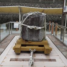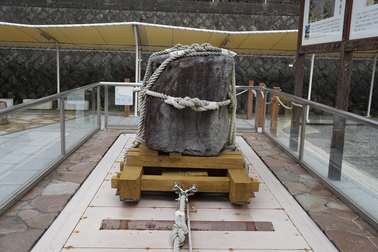 伊豆稲取駅を出たところが江戸城築城石ふるさと広場。かつて稲取の辺りから江戸城の石垣がたくさん船で運ばれたんだそうです。その紹介をするパネルがあったり、コロに乗せた築城石を実際に引っ張ってみるといったことができたりとけっこうPRしています。