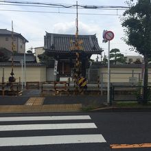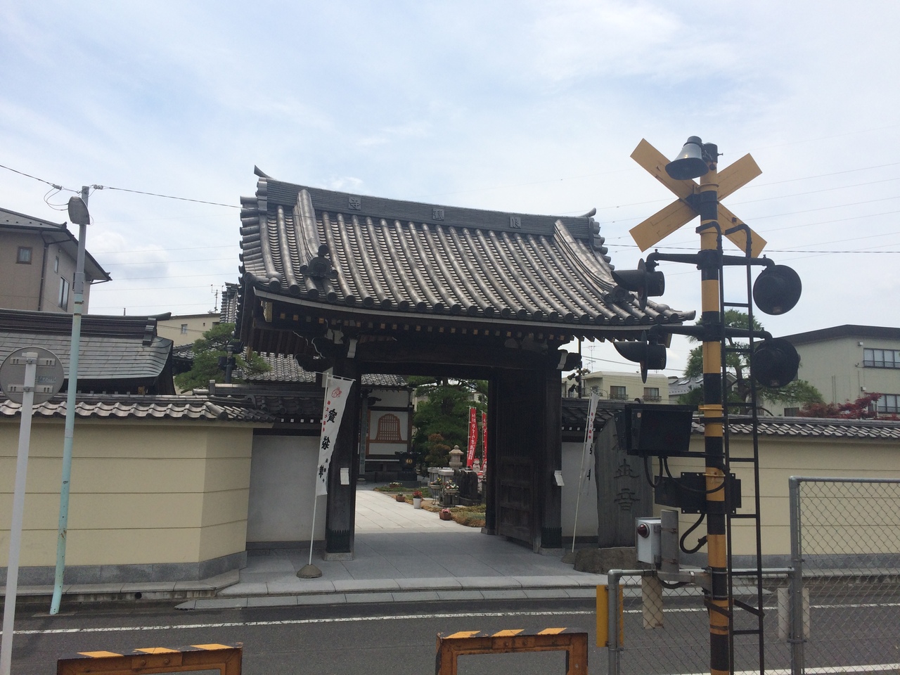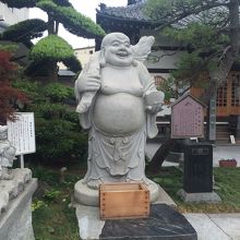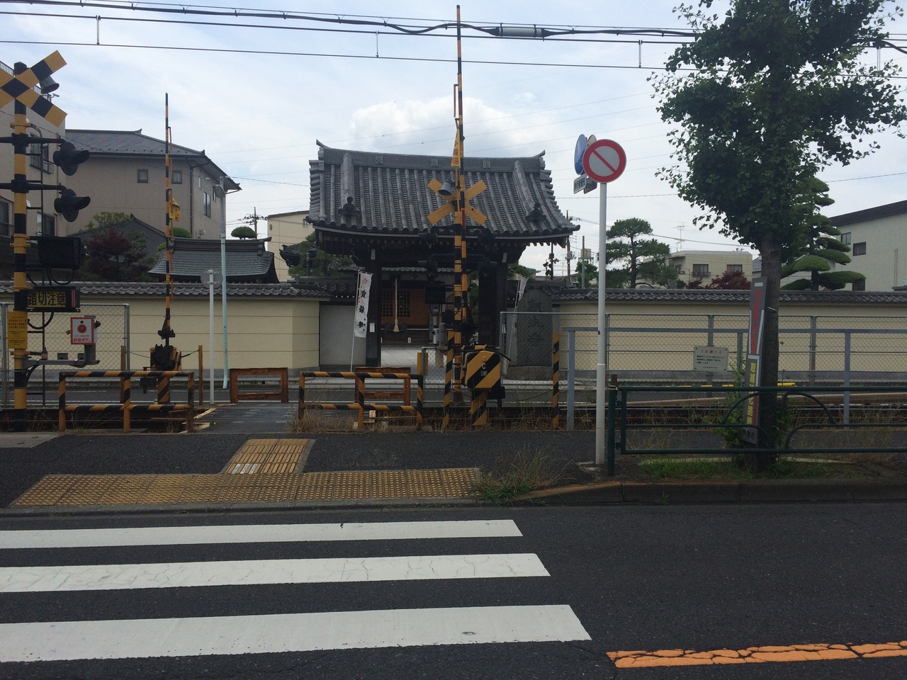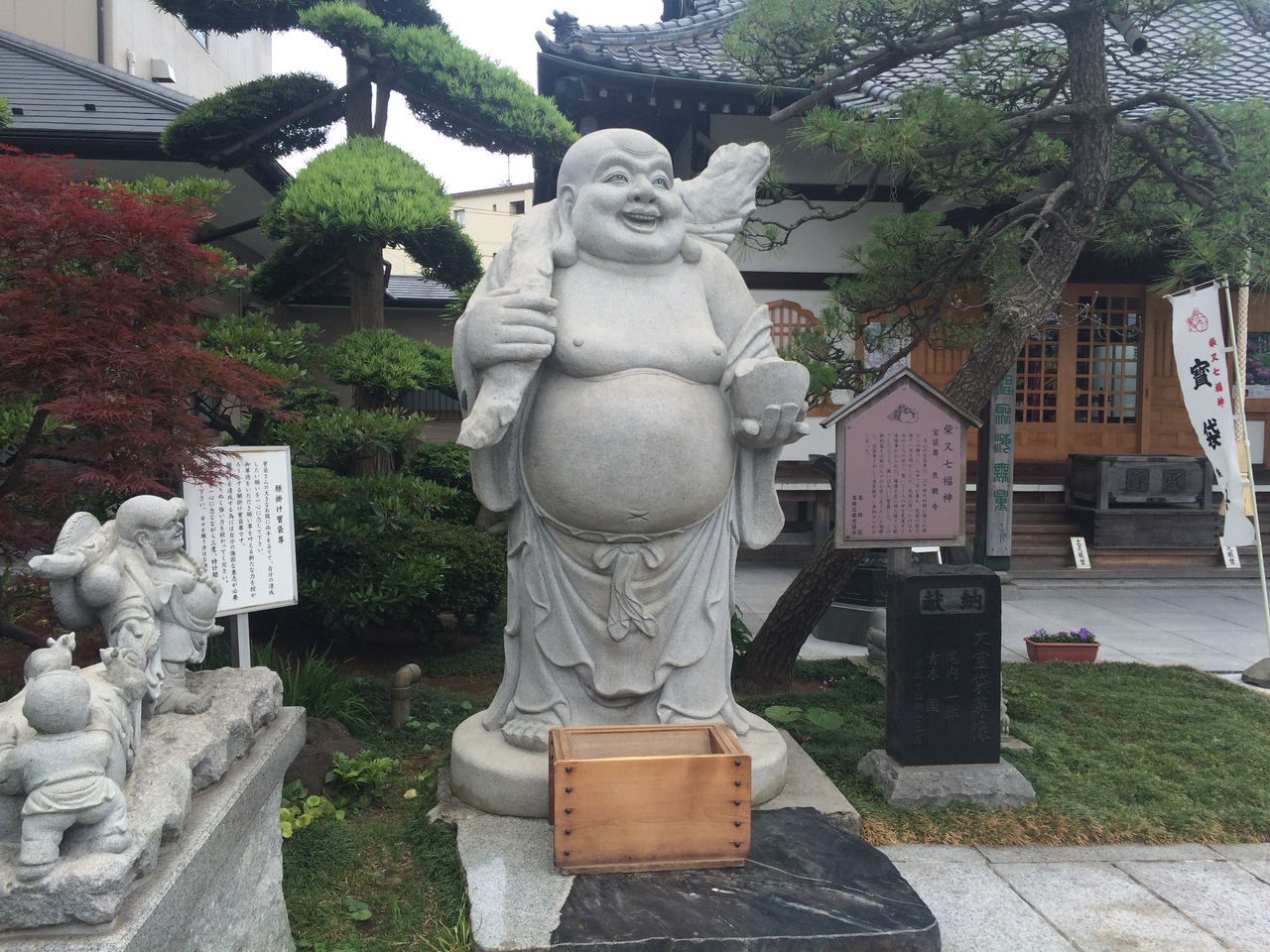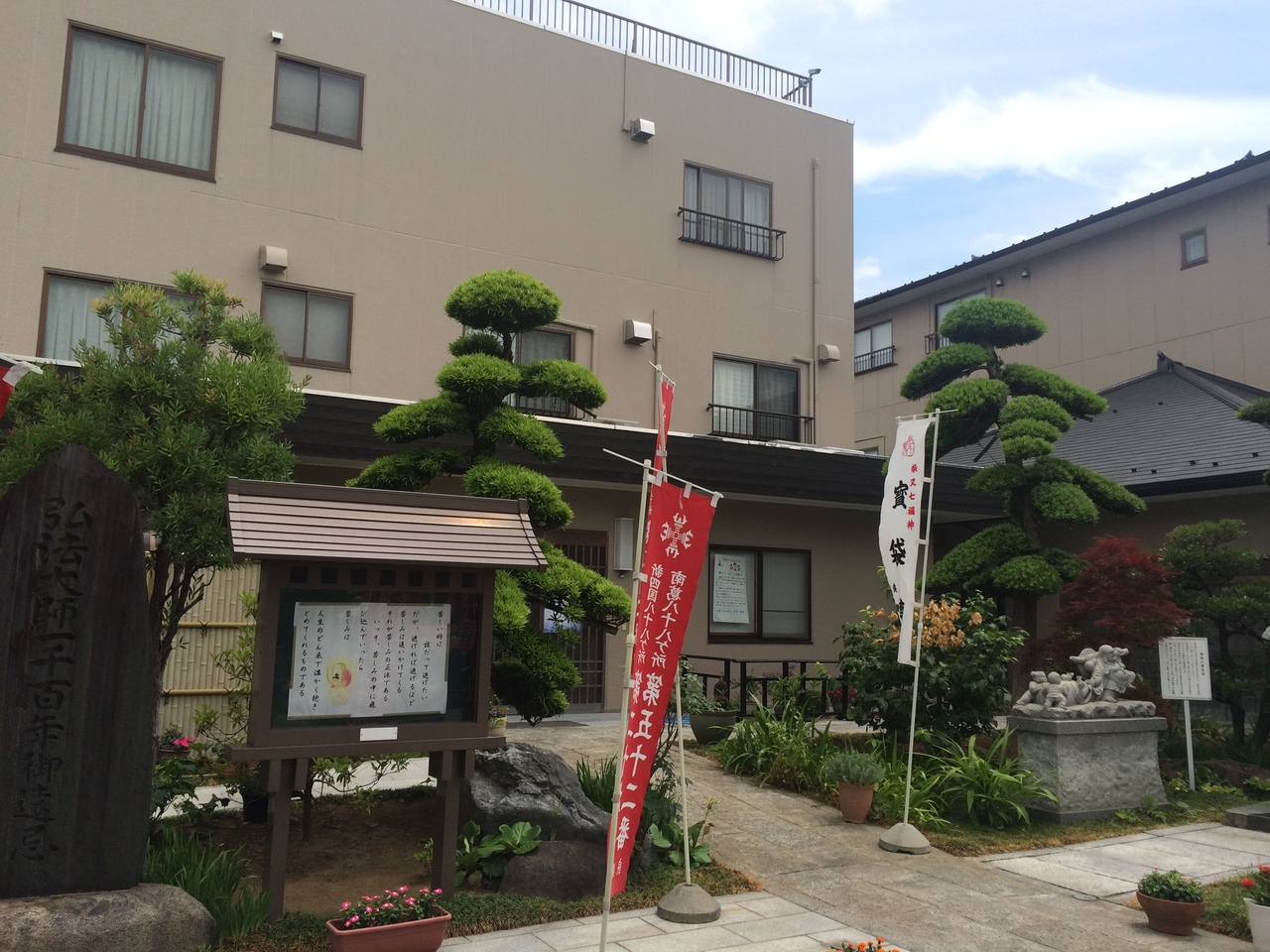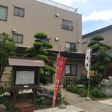 隣接して京成電車の線路です。境内はこじんまりしていて入って右側がお墓で手前に地蔵様が並んでいます。綺麗に整備されていて、願い叶えるお腹が出た白い像が立派です。柴又七福神の寺の一つで、赤い旗と白い旗が本殿の左右に幾つかあり目立ちます。