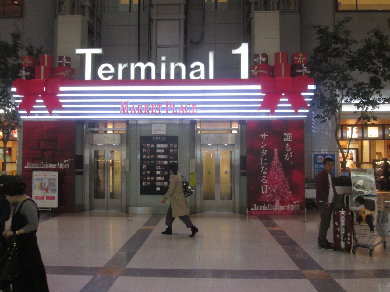 クリスマスシーズンに羽田空港を利用しました。第1ターミナルには大きいクリスマスギフトが飾られ、おもしろかったので記念撮影をしてみました。夜遅い時間帯で雪は降っていませんでしたが、すっかりクリスマスモードになったことを感じた瞬間でした。