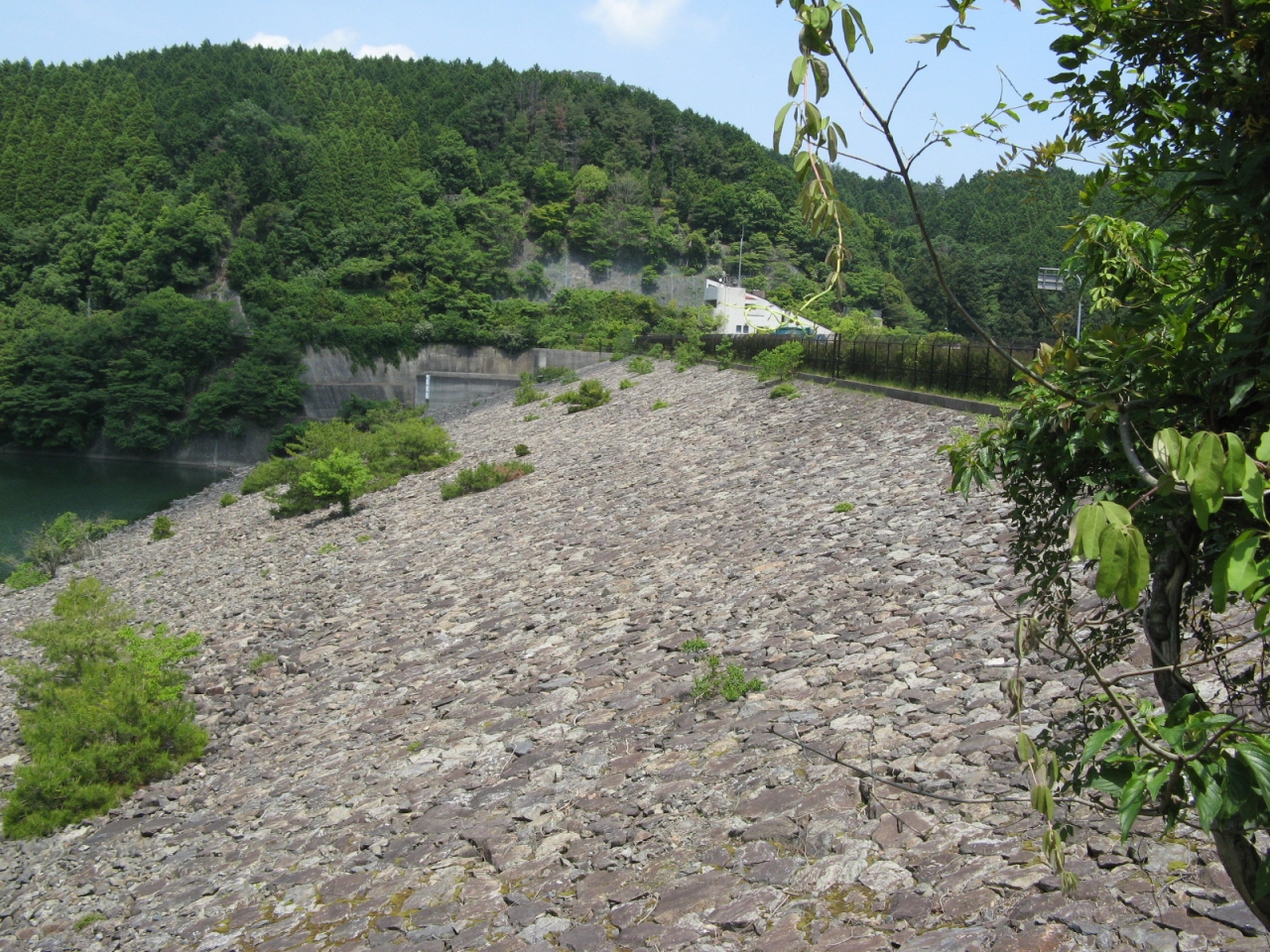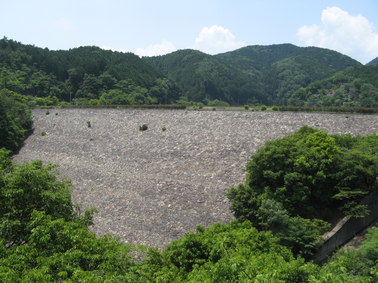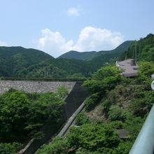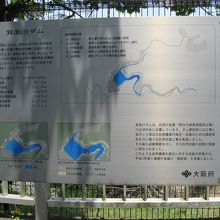 府道43号線沿いの勝尾寺から1?ほど西に走り、府道4号線に入って500mほど進むとダムの堰堤が見えてきます。堤高47m、堤頂長222.5mもある大きなもので目を奪われます。ダムのそばに管理所はありますが無人で、駐車場もありません。堤の上を車で走って堤を渡り切ったすぐ右手に、ベンチを備えた東屋のようなものがあり、金網越しにダム湖を見渡すことができます。また、東屋の近くにダムの諸元を表示した案内板があります。駐車場はありませんので、一時的に道路わきに駐車することになります。