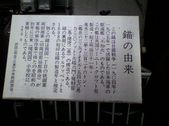 日露戦争で活躍した駆逐艦「不知火」の錨なんだそうです。1898年製造と推定されているこちらの錨。軍艦の解体作業で得た錨を、鉄鋼業の会社から小学校に寄贈されたものだそうです。