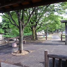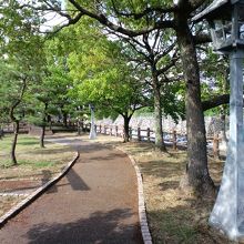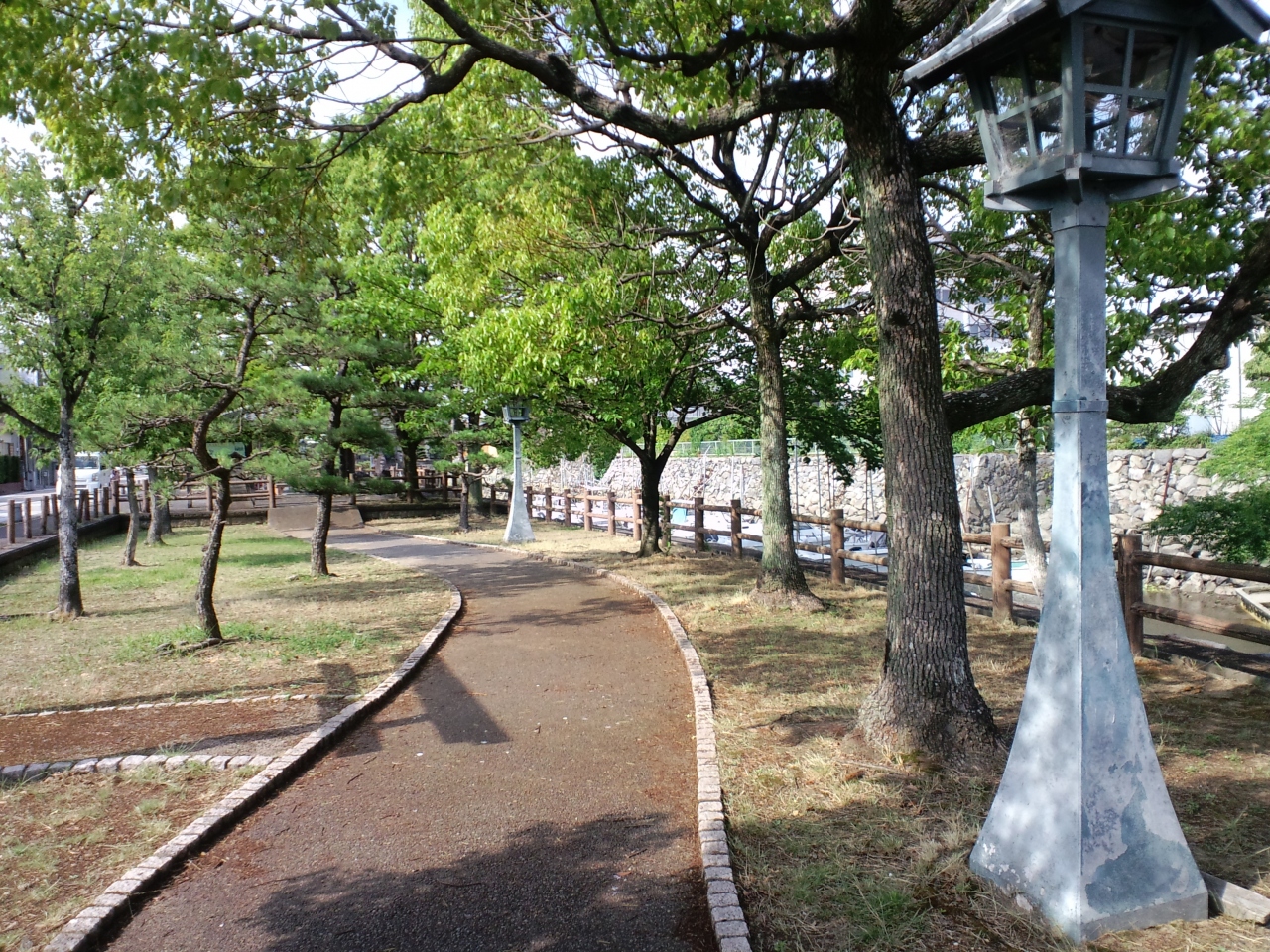 水路沿いに細長く続く公園で、歩道と公園とが一体になっています。