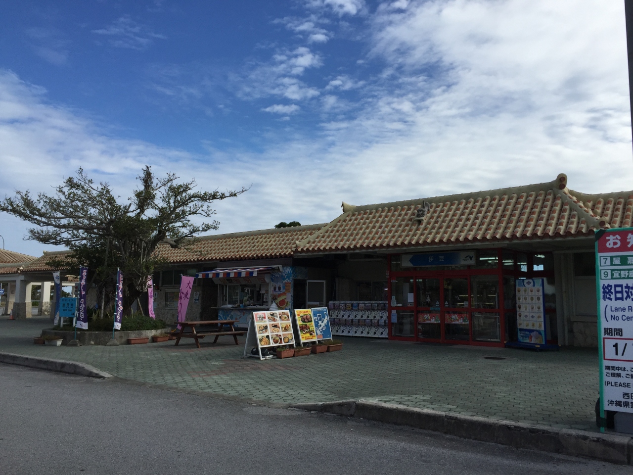 建物の中には簡単な売店と食堂がありました。昔ながらの古い建物チックで、沖縄らしく瓦屋根です。