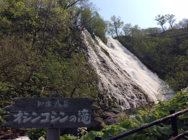 斜里町からウトロ間の海岸線にオシンコシンの滝があります。滝の案内看板があり見過ごしていくことはありません。駐車場はバスと乗用車と区切られていて乗用車は少し歩きます。海岸近くの山から落ちているいる滝の水はわずかな川を流れて直ぐに海に注ぎます。