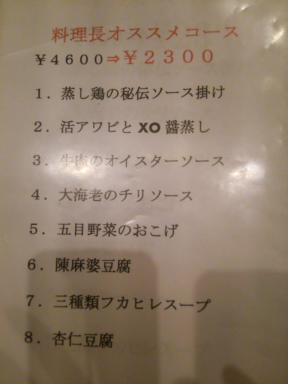 ちょっとずつ色々食べたいということで、「料理長おすすめコース¥2300を大人四人で三人前を注文しました。