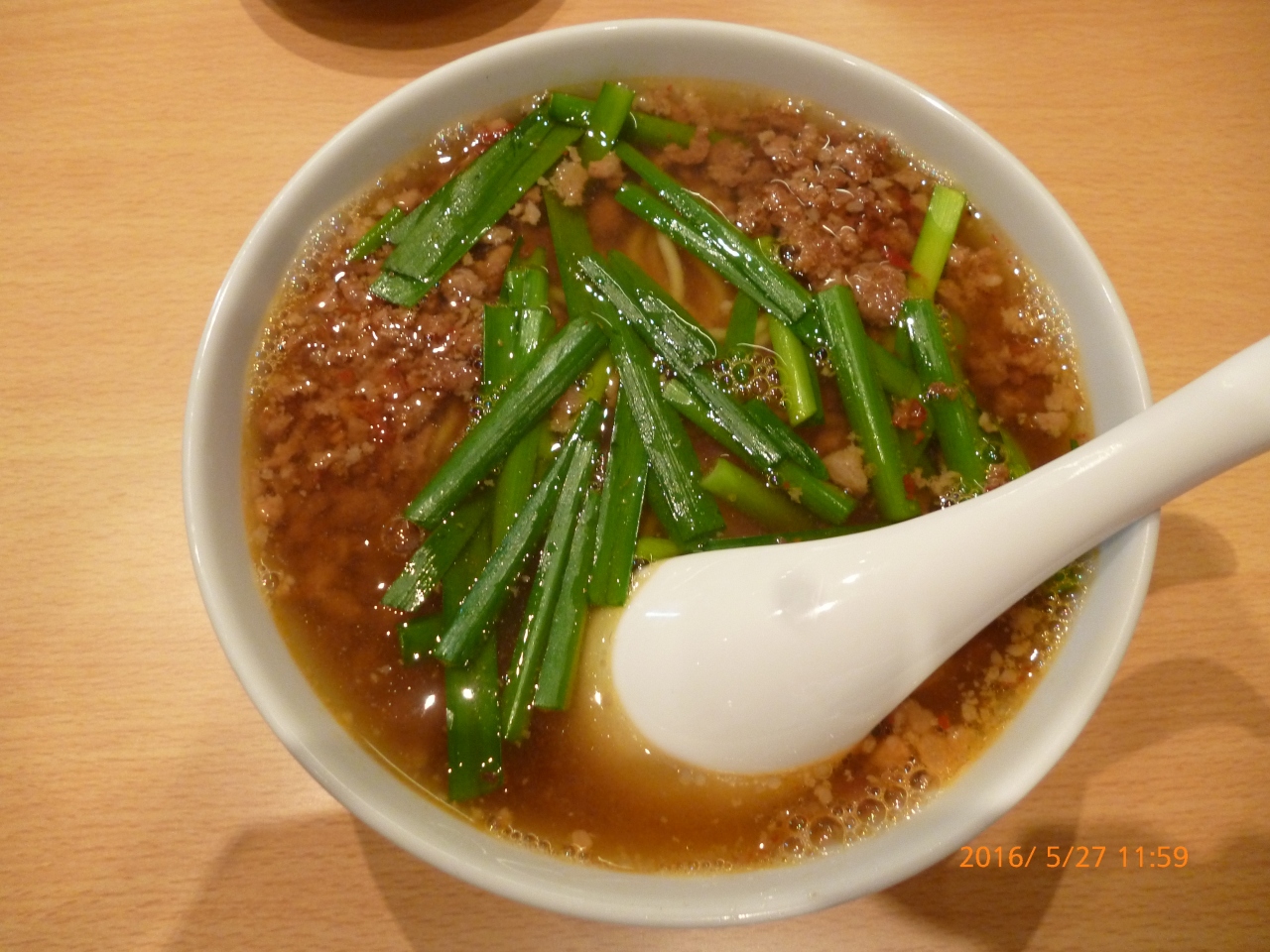 麺の上にひき肉とニンニクと赤トウガラシが、たっぷりと載っており、辛さの裏に深みのある味わいです。