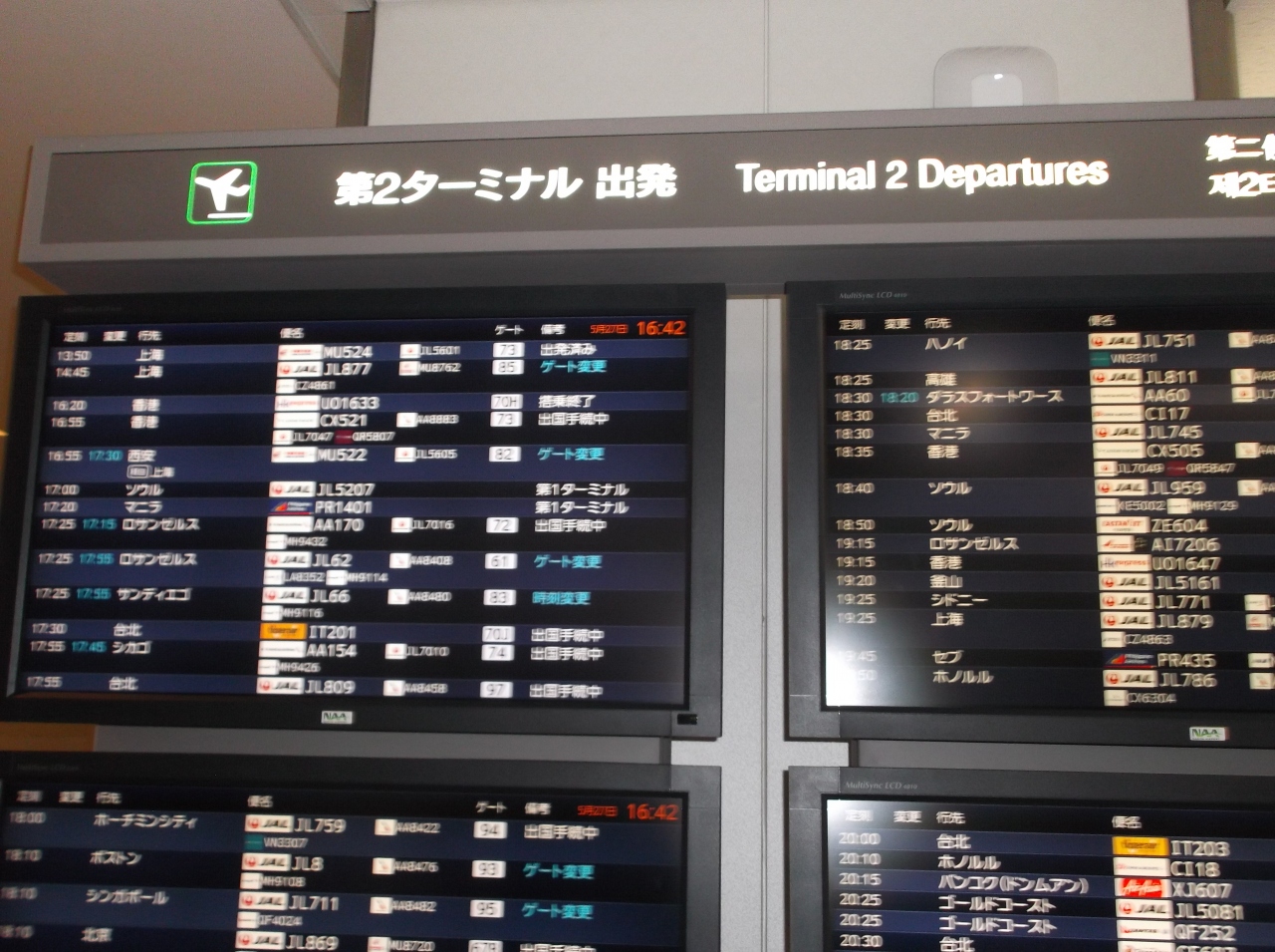 成田第二ターミナルの乗り継ぎレーンを利用しました。 荷物と人のチェックをすませたら、すぐ出国審査の窓口があり、とても早く終わりました。