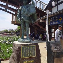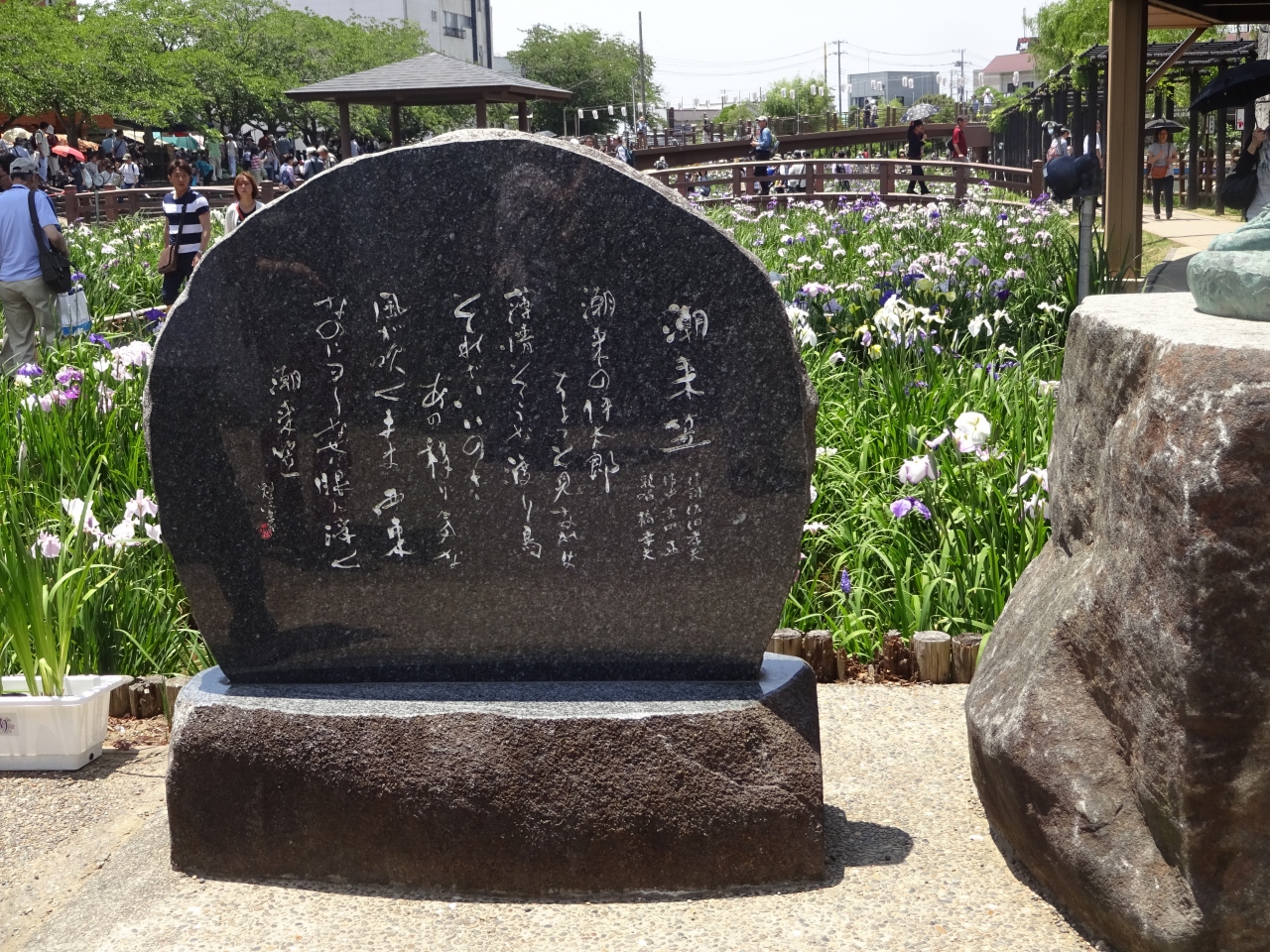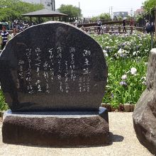 隣の歌碑と共に前川沿いにあるあやめ園前のろ舟の待合所の前に建っている。