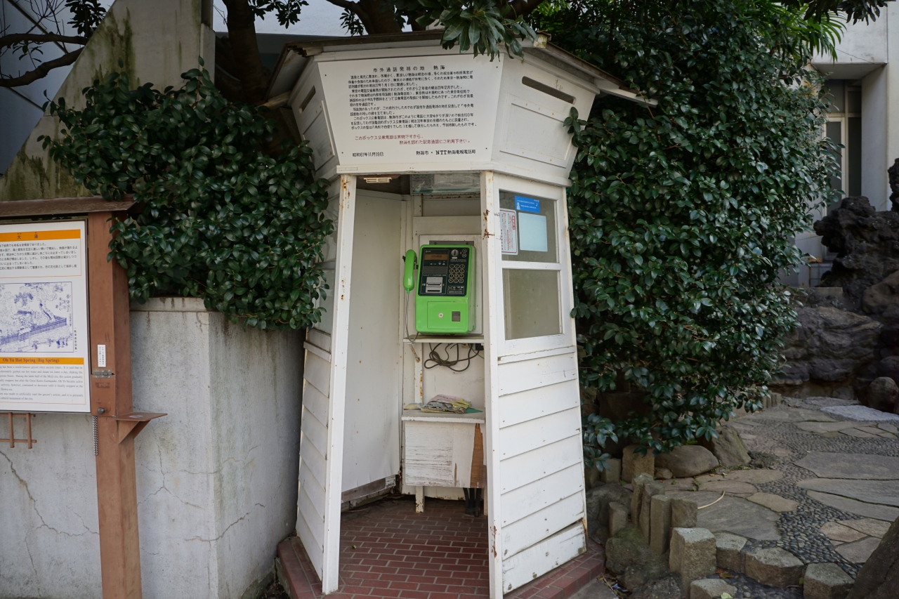 大湯間欠泉の隣りに電話ボックスがあって、これが市外電話創始の地。明治のころに、熱海と東京間で電話ができるようになり、それが日本で初めての市外電話だったのだとか。熱海と東京の距離は交通機関の発達した今と違ってもっと遠いものだったはず。その利便性はすごいものだったと思います。