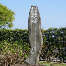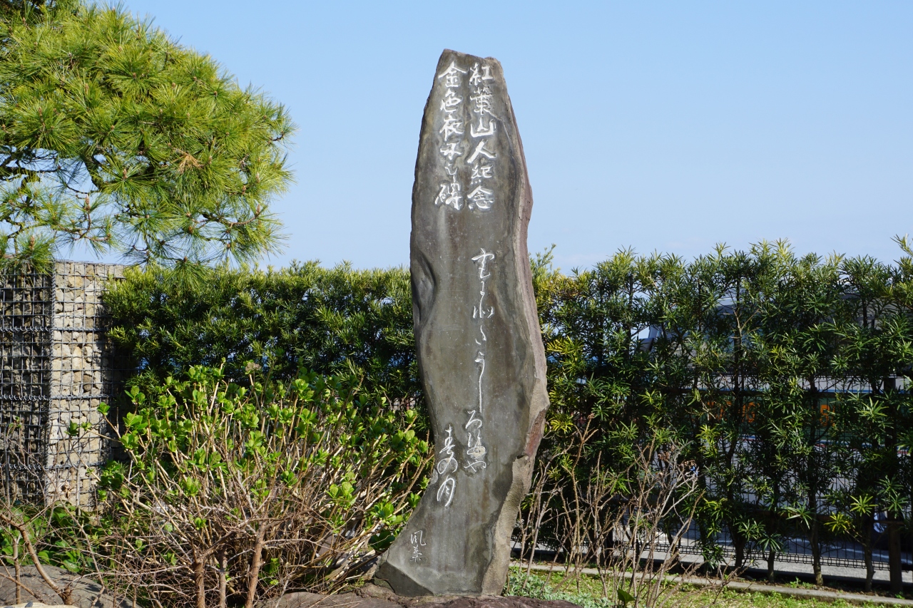 金色夜叉の碑の碑は、貫一、お宮の像と同じ敷地内。尾崎紅葉の名作として知られますが、熱海の海岸を歩く二人連れという名場面の設定が熱海の名前をいっそう不動のものにした感がある。碑はスリムなちょっと変わった石を使っています。