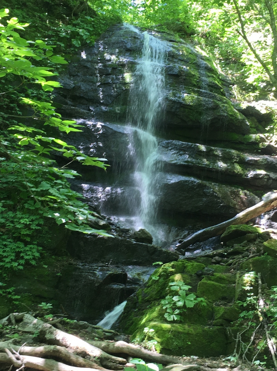 銚子大滝から少し焼山方面に行ったところにある滝です。遊歩道からも眺められますが、小道を少し入ると、すぐ近くまで行くことができました。岩肌を縫うような感じで流れており、洗濯岩のような岩なので、九段以上ありそうでした。