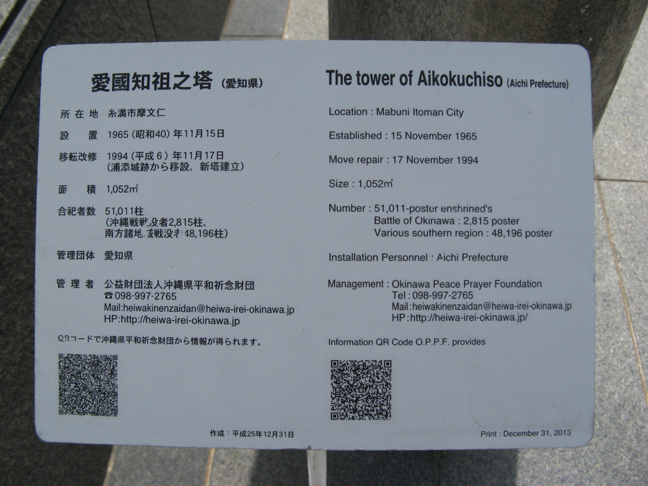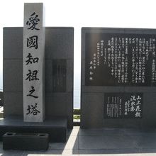 塔の丸型形状は平和を象徴するとともに、愛知県と沖縄県が共に面する太平洋をイメージしているそうで、「祖先を知り、国を愛す」との思いで「愛国知祖之塔」と命名されています。