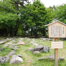 名古屋城天守閣近くの不明門を出て少し先にあります。草地広場のような場所に大きめの石がごろごろと置いてあり、なんだろう?と案内板を見たら、「天守礎石」の説明がありました。焼失してしまった旧天守の礎石で、天守閣再建にあたり、この場所に移してかつての敷設状況を再現しているようです。