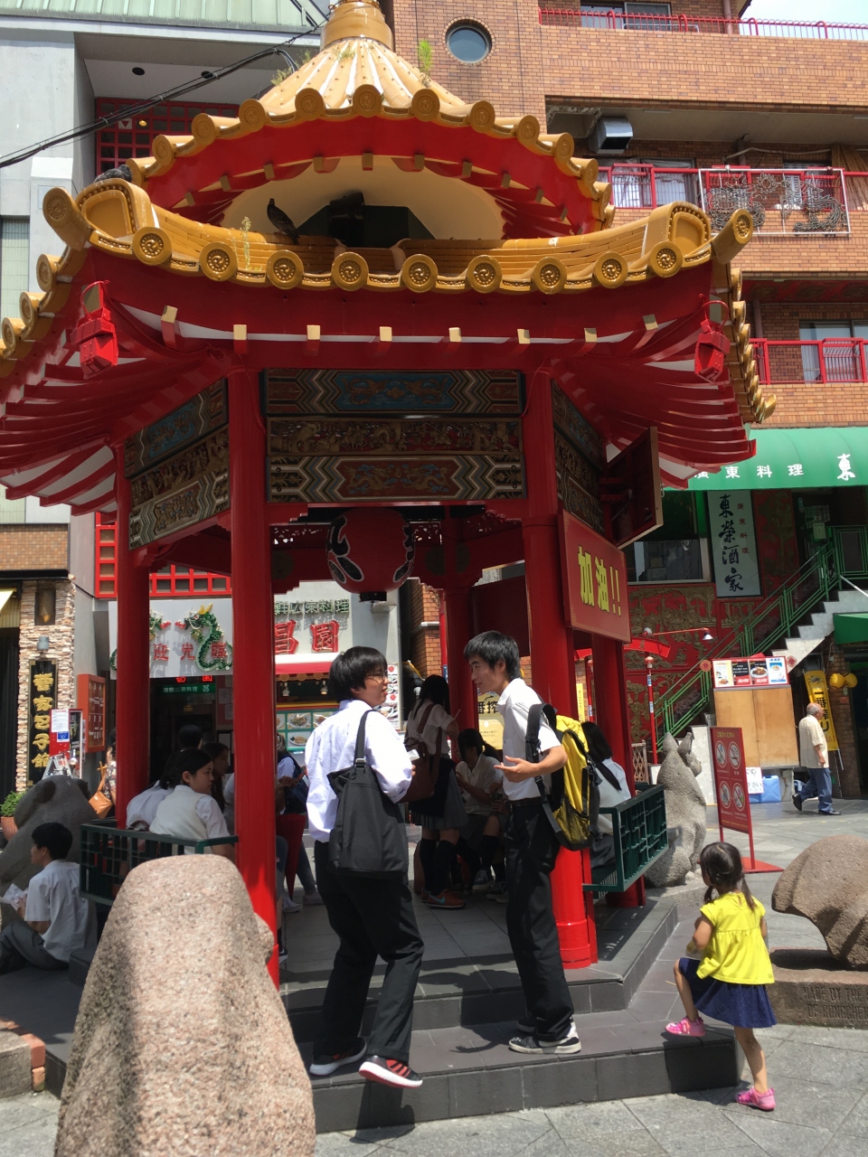 神戸の中華街(南京町)の中心街に位置する東屋。まわりには人気の豚まん屋さんもありますし、中には椅子などもあって一休み出来るようになっています。いまは6月の修学旅行の真っ最中。ここの東屋は修学旅行生さんが多い場所にもなっています。