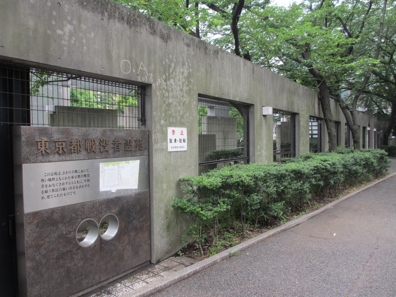 地下鉄後楽園駅を出て、隣にある礫川公園の階段を上った所にある霊苑です。満州事変から太平洋戦争終結までに亡くなった東京都関係の戦没者の霊が祀られています。苑内には鎮魂と書かれた碑や、遺品展示室があり一般に公開されています。今の平和がここに眠る人たちによって維持されているにもかかわらず、苑内に建つ墓石を連想させる石のモニュメントに、多くの落書きが書かれていたのは、全く残念でした。