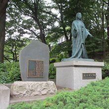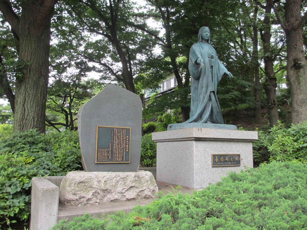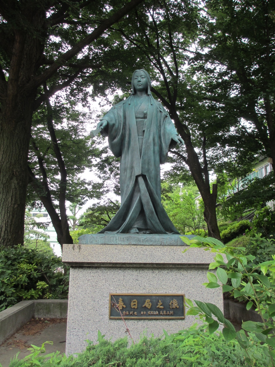 後楽園駅前の礫川公園の植え込みの中に立っています。文京区の春日の地名は三代将軍徳川家光から家光の乳母として仕えた春日局が拝領した土地に由来してます。昔は春日殿町と呼ばれてました。春日局の菩提寺麟祥院が湯島にあり、NHK大河ドラマ春日局が放映されたことを契機に文京区に春日局推進協議会が設立されました。その事業を記念して1989年にこの春日局像が建立されました。文京区春日の地名の由来を知り、春日通りに向かって凛として立っている像を見て歴史を身近に感じました。