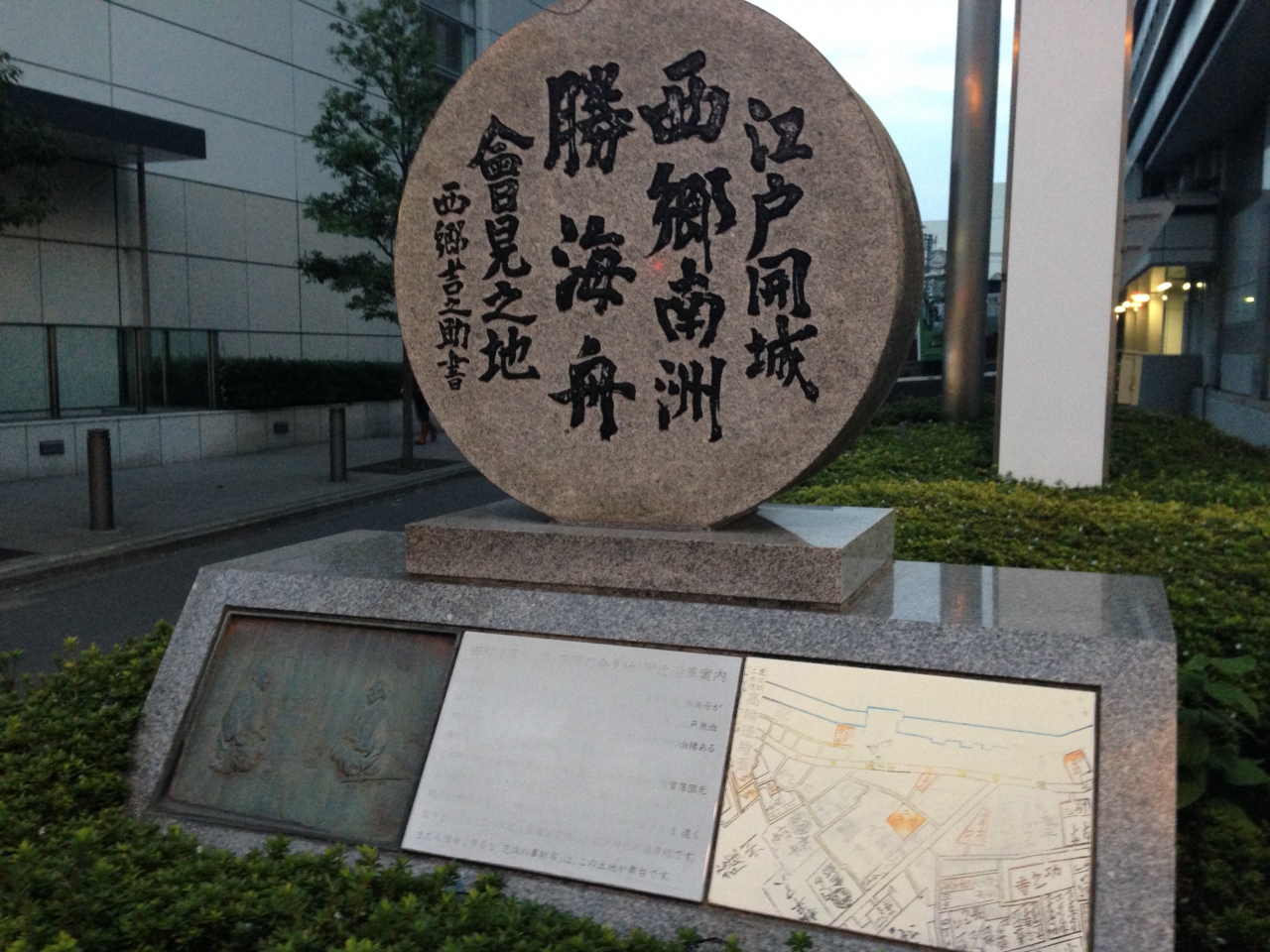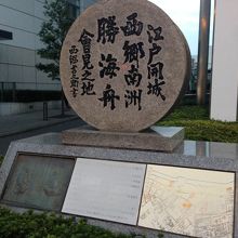 東征大総督府の参謀である西郷隆盛と、旧幕府徳川家陸軍総裁の勝海舟の会談がここにあった薩摩藩邸で行われ、長い交渉の結果江戸城の無血開城となった。江戸の街を燃やすことなく平和裏に終わったことを記念して第一田町ビルの第一京浜道路脇にこの石碑があります。ビルの隅っこにあるためよく探さないと分かりません。