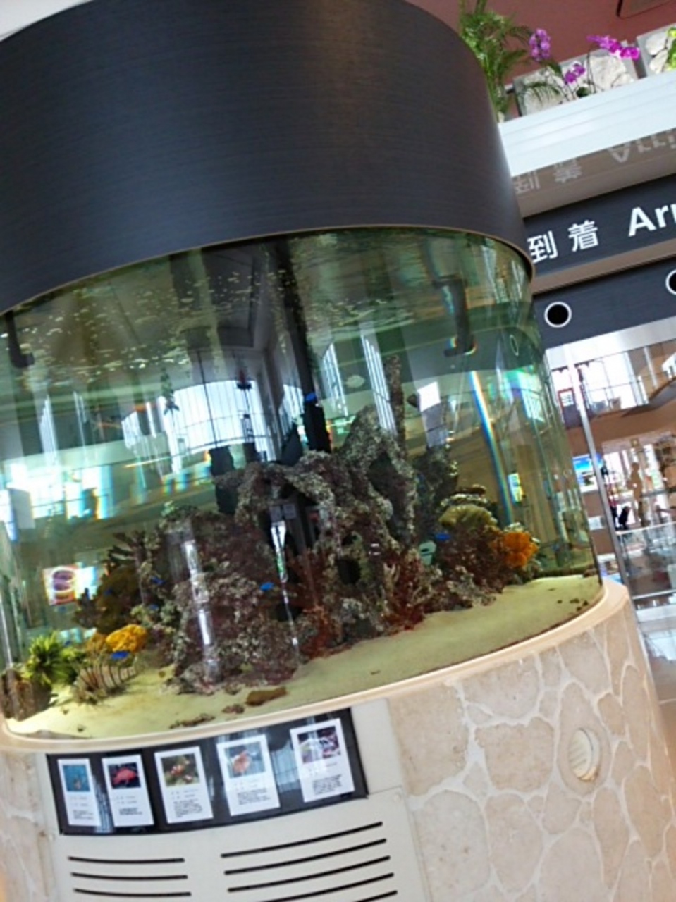 空港のロビーに水槽が。熱帯魚たちがお出迎えです。時間をかけて美ら海水族館に行かなくても、青やピンクのかわいい魚たちが、南国気分を盛り上げてくれます。外の壁にはもちろんお馴染みシーサーも笑顔でいてくれました。