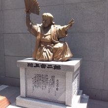 上川端商店街のアーケードの入口脇に建っている銅像です。すぐ傍に地下鉄の中洲川端駅もあります。川上音二郎が扇子を持って踊っている姿を銅像にしてあります。川上音二郎と言うと、すぐに思い浮かぶのがオッペケペー節ですね。踊っている姿が似合っています。