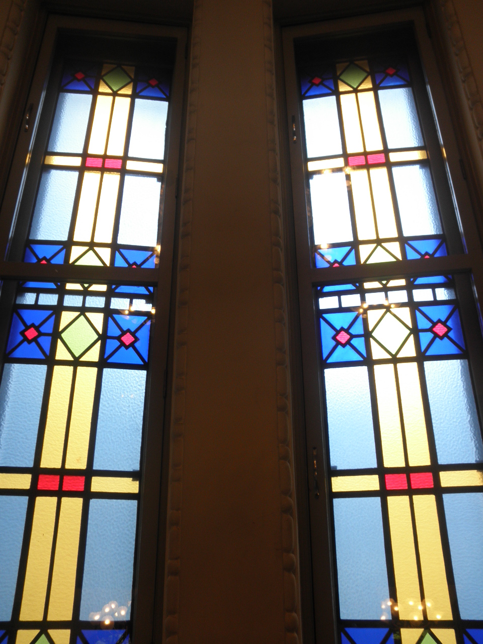 外観は裁判所の面影を残し、中のステンドグラスや手すりも趣があります。