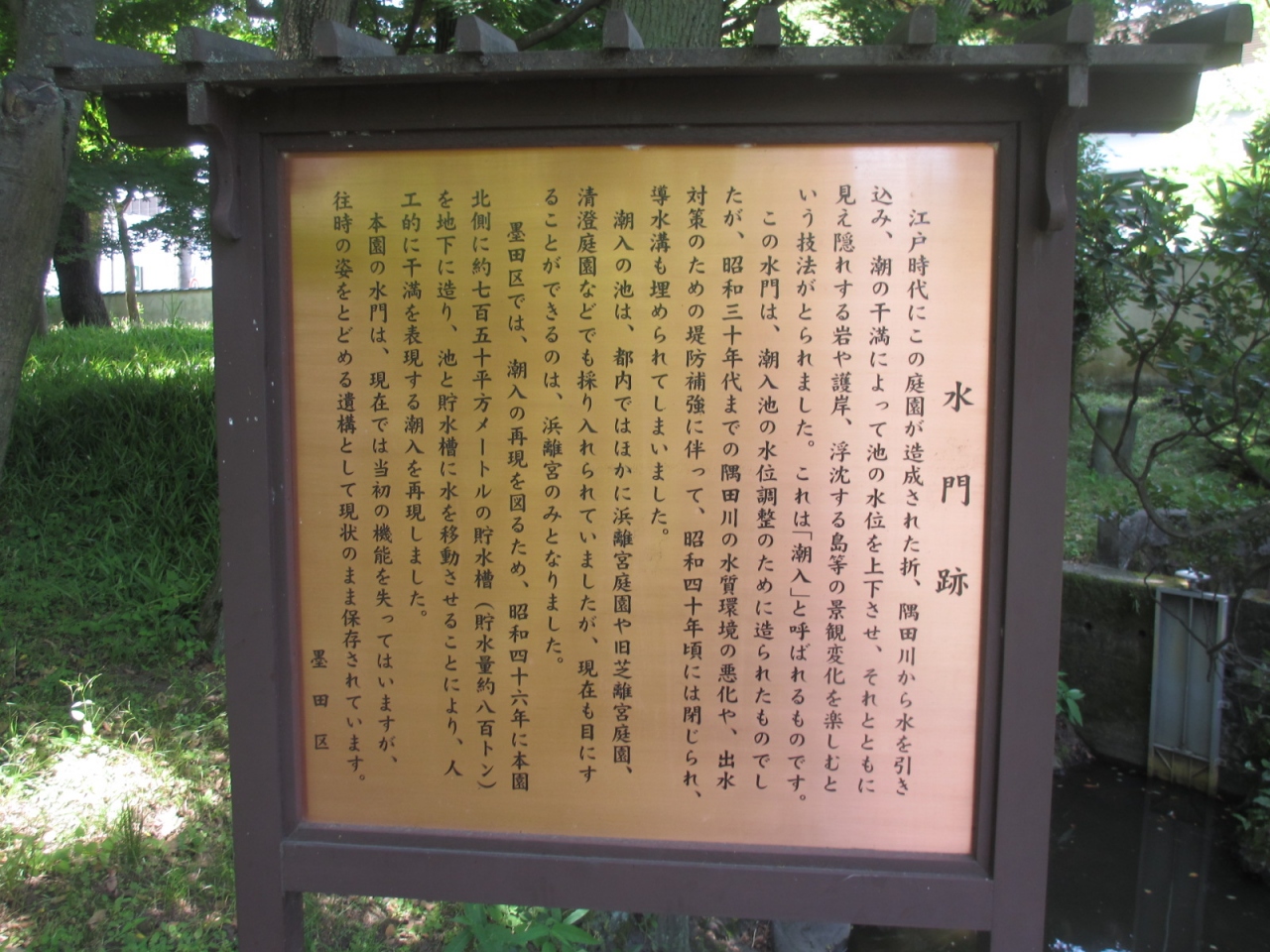 両国界隈を散策して旧安田庭園に行った時に見ました。庭園の入口から入り左手に進んでいくと、わりと大きな説明板があるので見つけることができると思います。潮の干満によって水位を上下させて景観の変化を楽しむ「潮入」という技法がとられていたそうです。風流な話だと思いました。