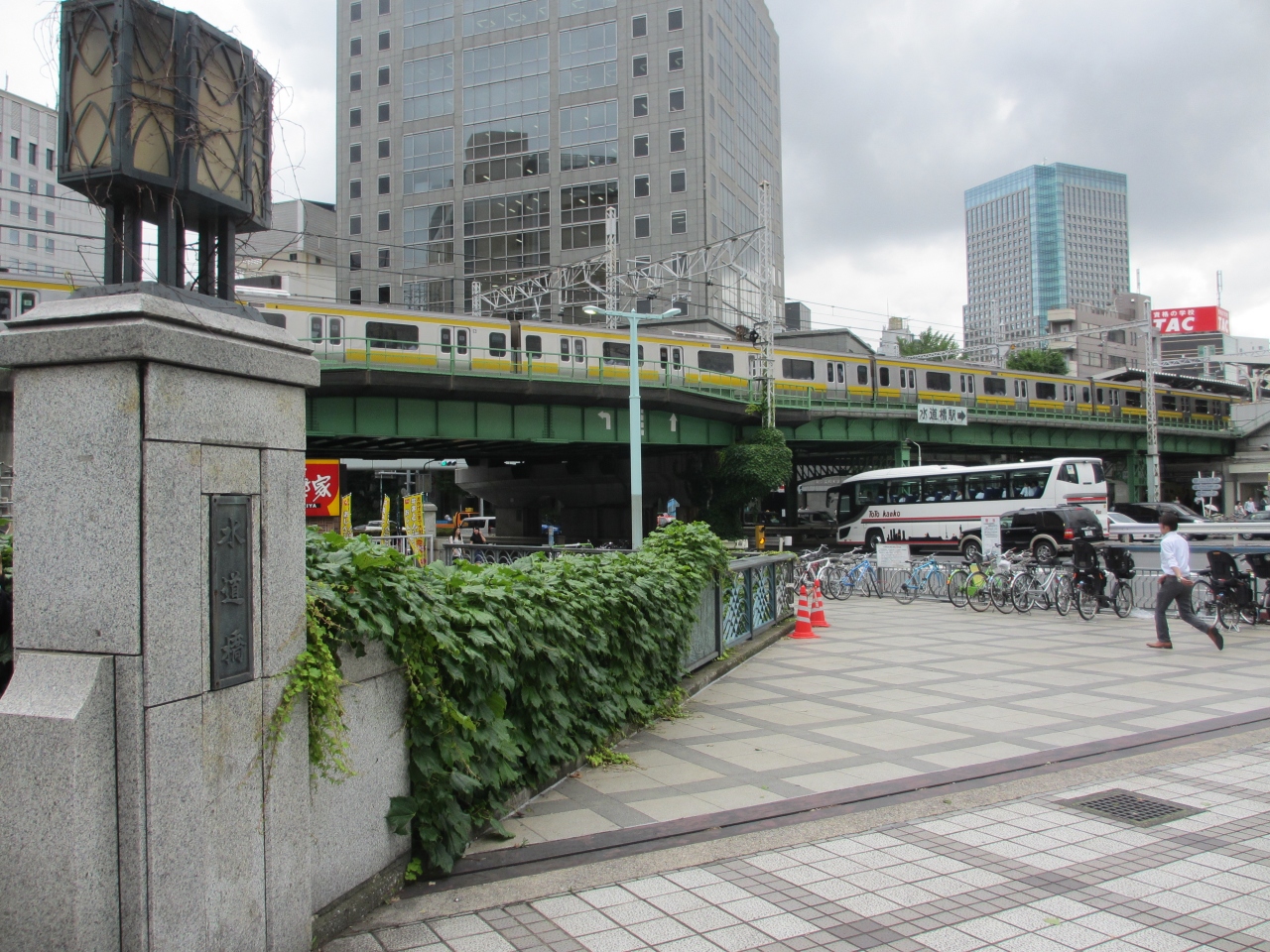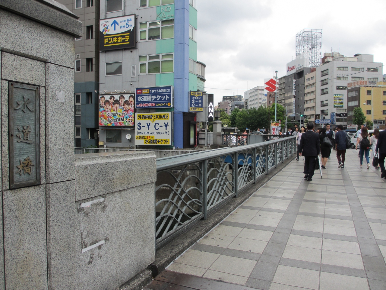 水道橋駅東口のそばの神田川に架かる橋です。江戸時代初期に架けられたのが始まりで、大火で焼失したり移転したりしました。1928年に鋼橋が架けられ、1988年に先代よりやや大きい現在の橋が架けられました。東京ドームシティや春日方面から水道橋駅や神保町方面へ向かう人が行き来してます。飯田橋側の橋にはレリーフが飾られています。御茶ノ水側の橋のそばにポール状のベンチがあります。待ち合わせ場所に利用されているようです。