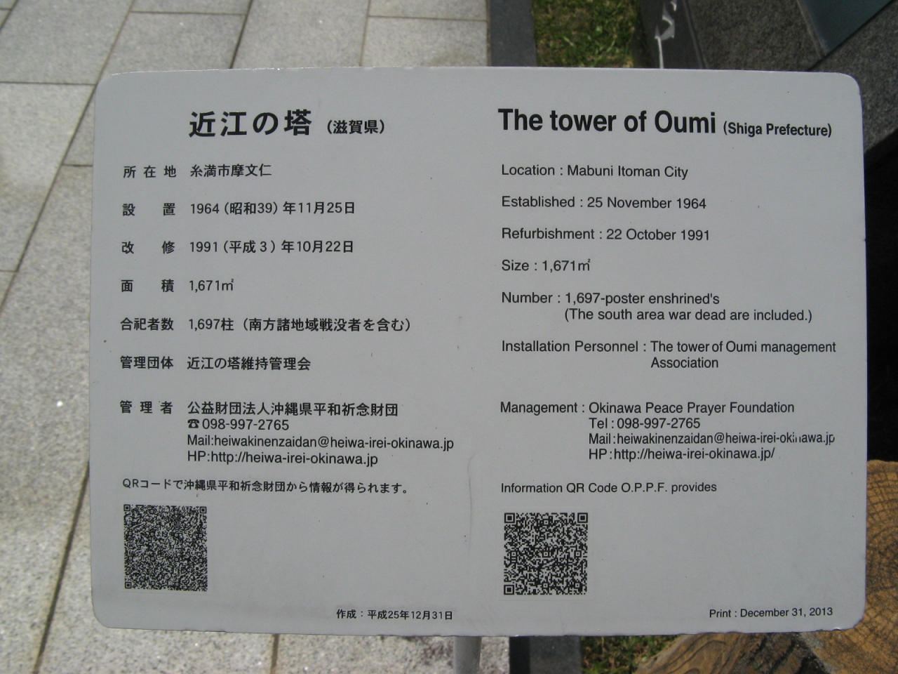 塔は、高さのある基壇の上に細めの塔体を載せたシンプルなデザインとなっていて、その前面左右に燈篭を配置しバランスをとっています。塔の背面には、戦没された1,673名のが刻まれた「沖縄方面霊名碑」が置かれています。