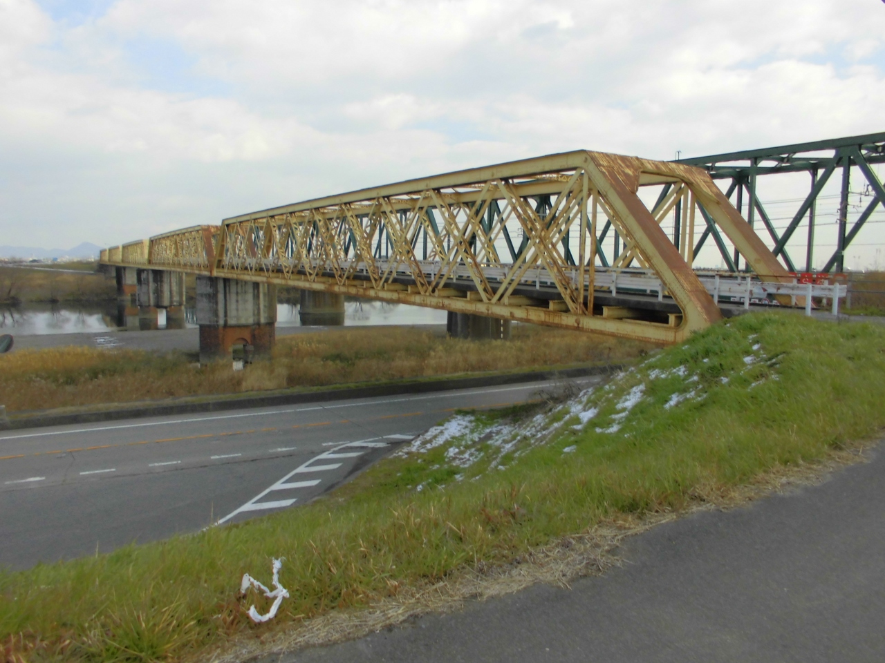 明治末期に架橋された鋼鉄製橋梁5連は、ピン組結合故に経年変化に伴ふ損耗が進行し、保守が困難になった事や、昭和20年(1945年)1月13日発生の三河大地震(みかわ だいじしん)に依り橋脚に亀裂被害が発生し、修復されたものの、戦争終結後、改めてエックス線検査を実施した処、重大瑕疵が発見された事から架替が決定し、昭和36年(1961年)に下流側に新橋梁が架橋された。