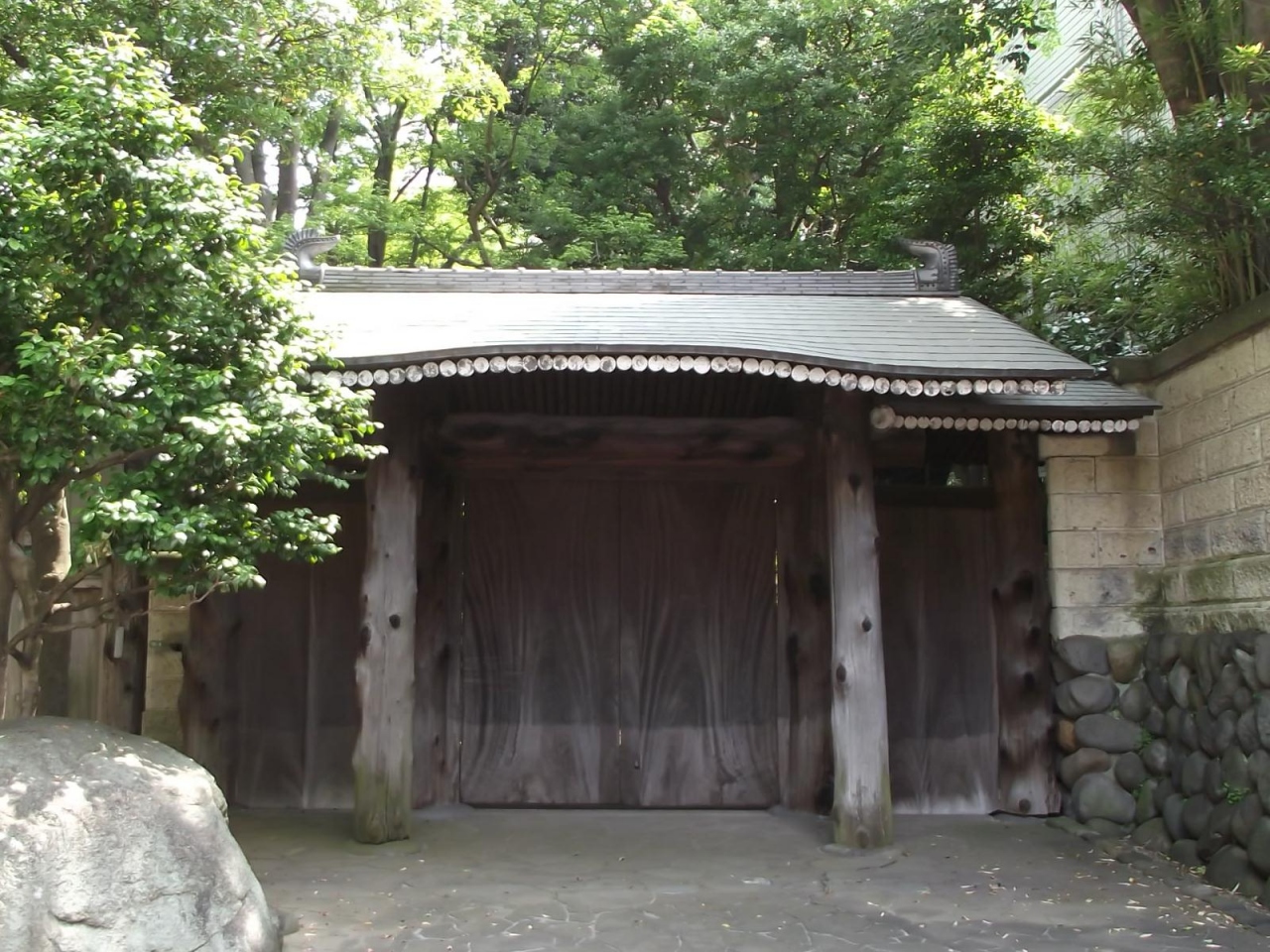 表門は大正2 (1913) 年の竣工、尾州檜の太い丸太材を用いた四脚門で、近付いて観るとその立派さが分かります。