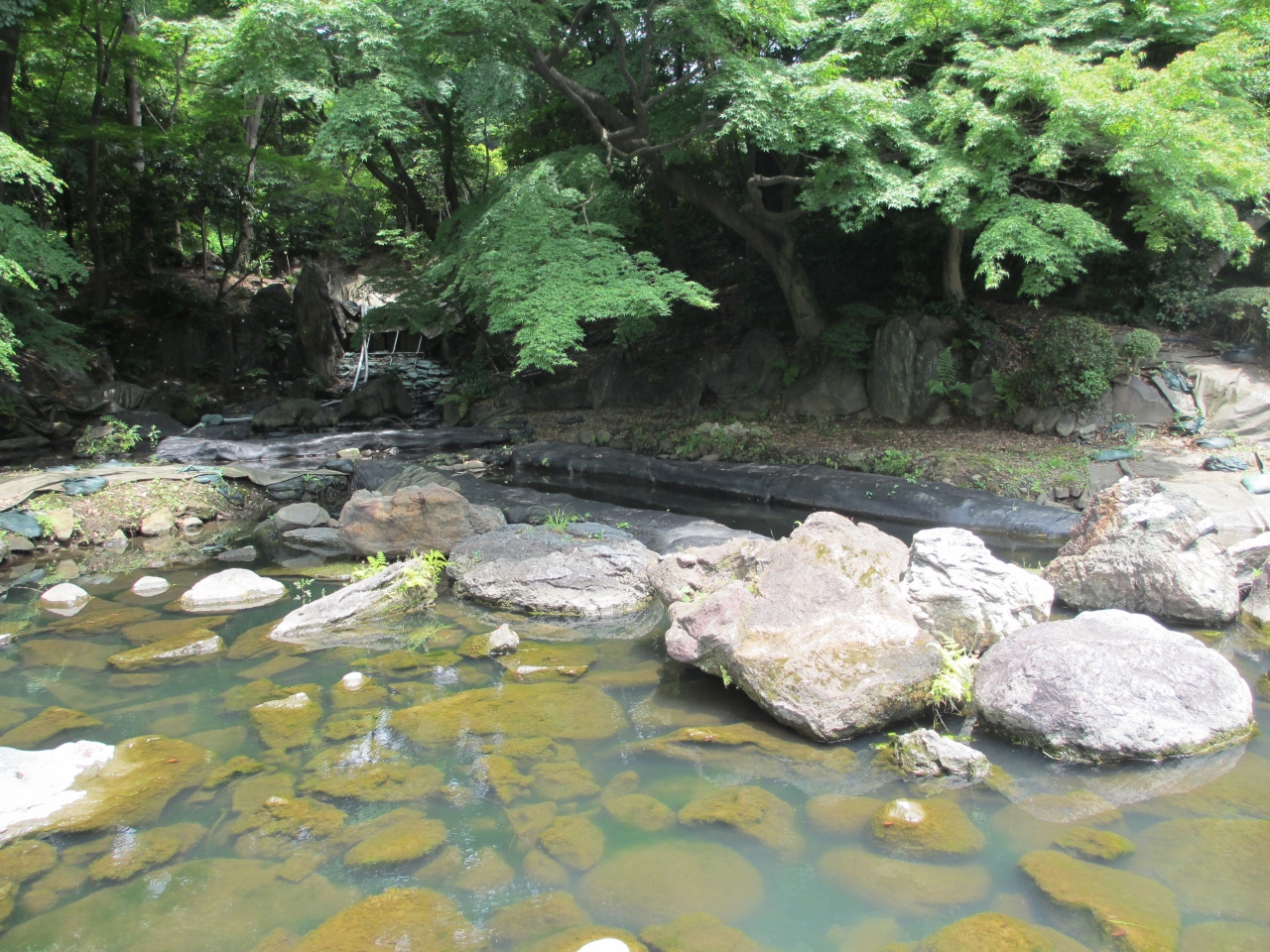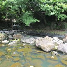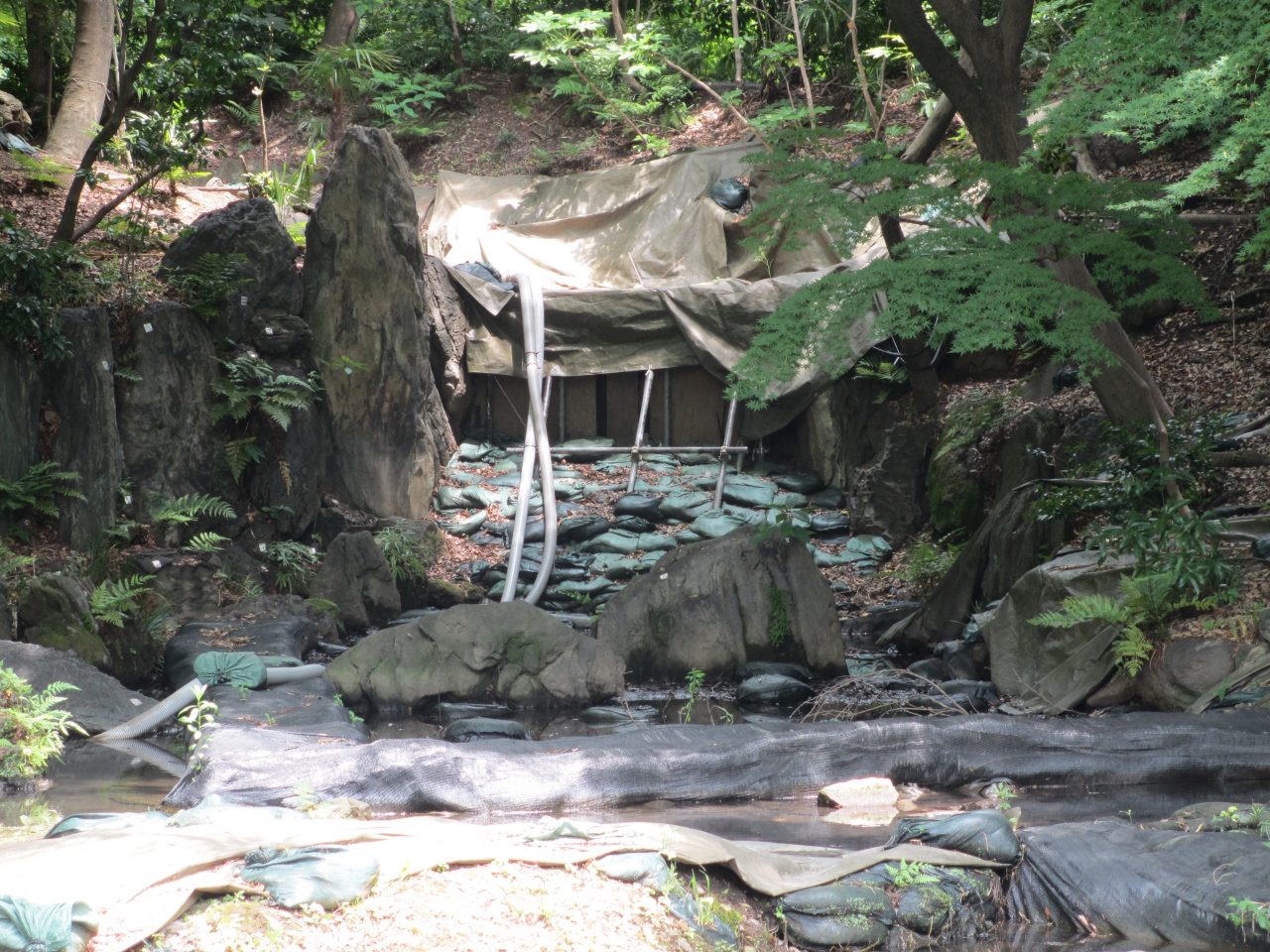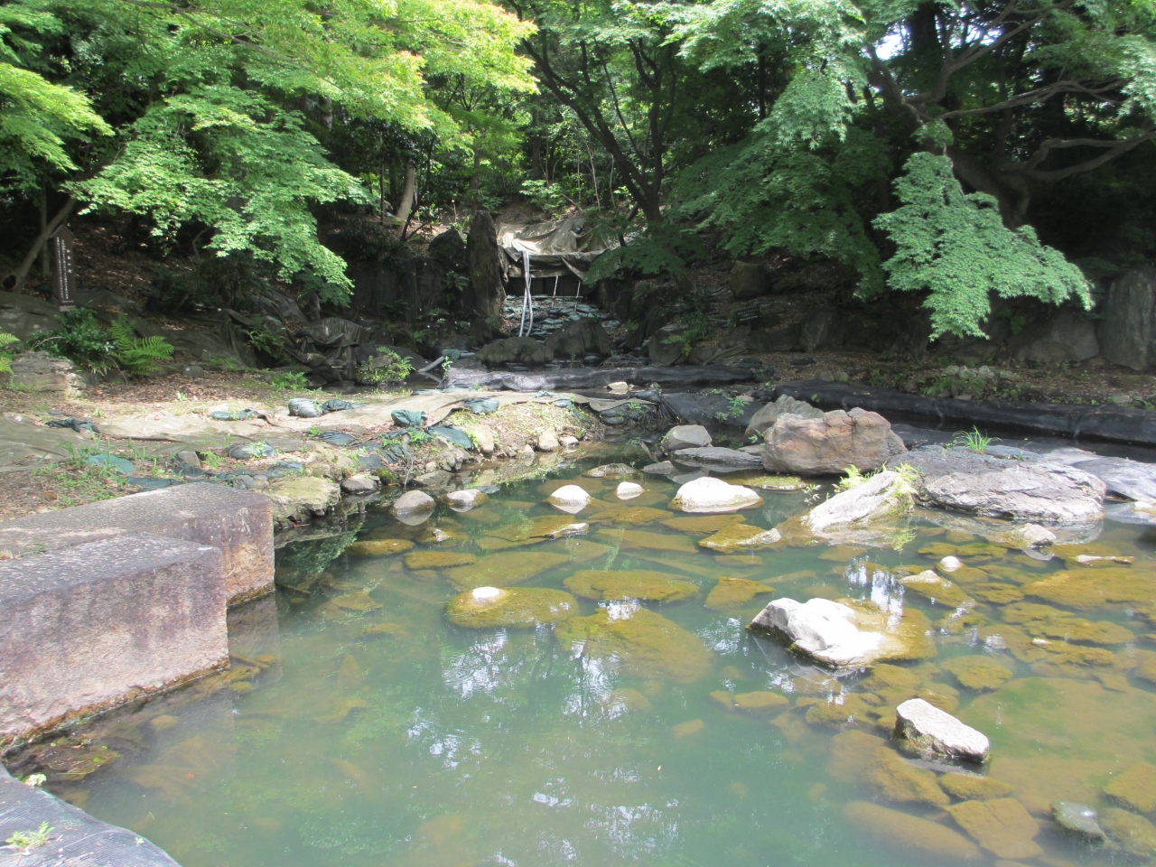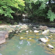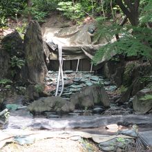 静岡県の白糸の滝を模して、六代目藩主が造ったものです。伊豆半島から持ってきた岩で造られ、石の上を歩ける沢渡になっていました。修復をするために工事を始めたら、地下から当時のものが出てきたため、学者間でどのように修復したらよいか話がまとまらず、二年間工事が滞ったままになっています。