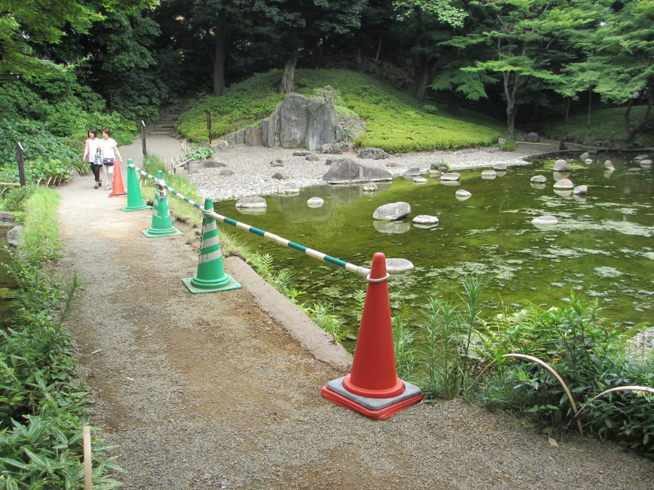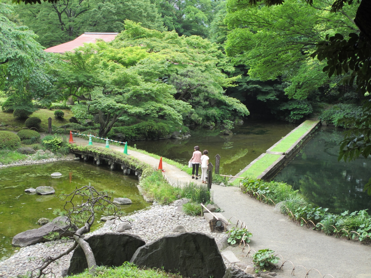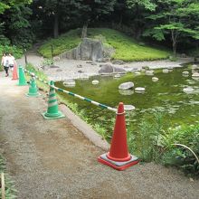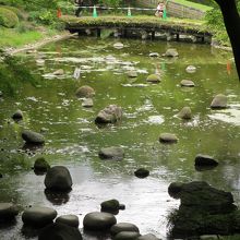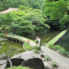 庭園入り口を左に進んだところにある土橋で、京都にある渡月橋を模して造られています。橋の下には大堰川が流れ、橋を渡った所には屏風岩が立っています。朱色の橋・通天橋も眺めることができ、通天橋と反対側には中国の杭州にある蘇堤を模した西湖の堤があります。