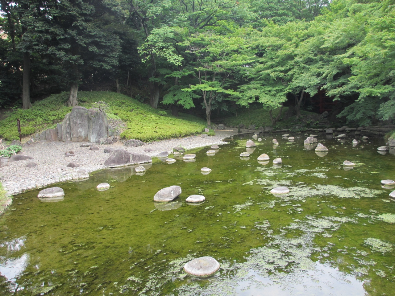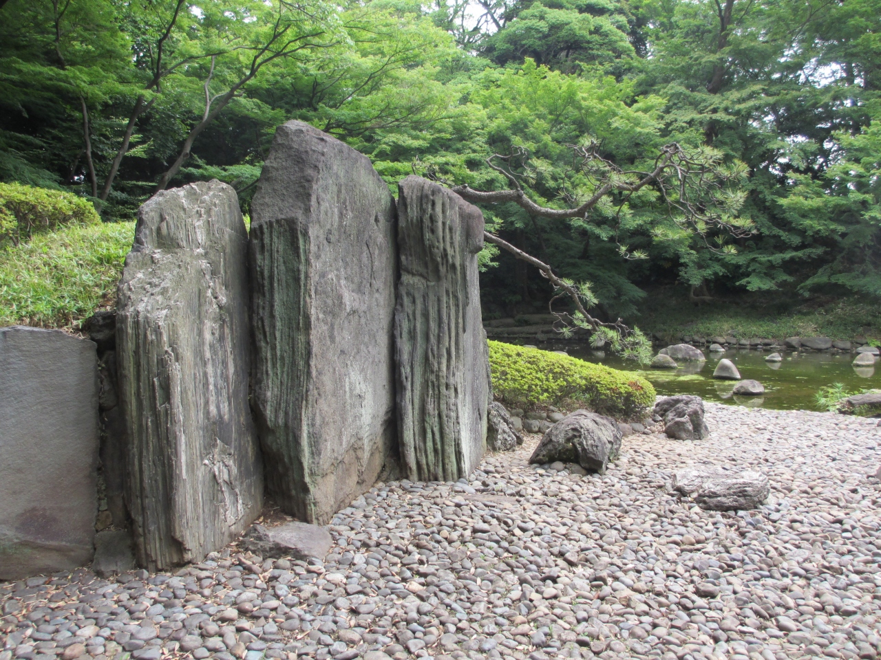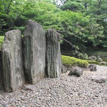 庭園内に架かる渡月橋近くに立つ大きな岩です。三つの縦長の平らな、屏風を連想させる岩で、近くを流れる大堰川川岸に立っています。また大堰川には徳川家光が腰かけたという言い伝えが残る石が残っています。真実はわかりませんが、家光と庭園を造った水戸藩初代藩主・徳川頼房が仲が良かったため創られた伝説かもしれません。