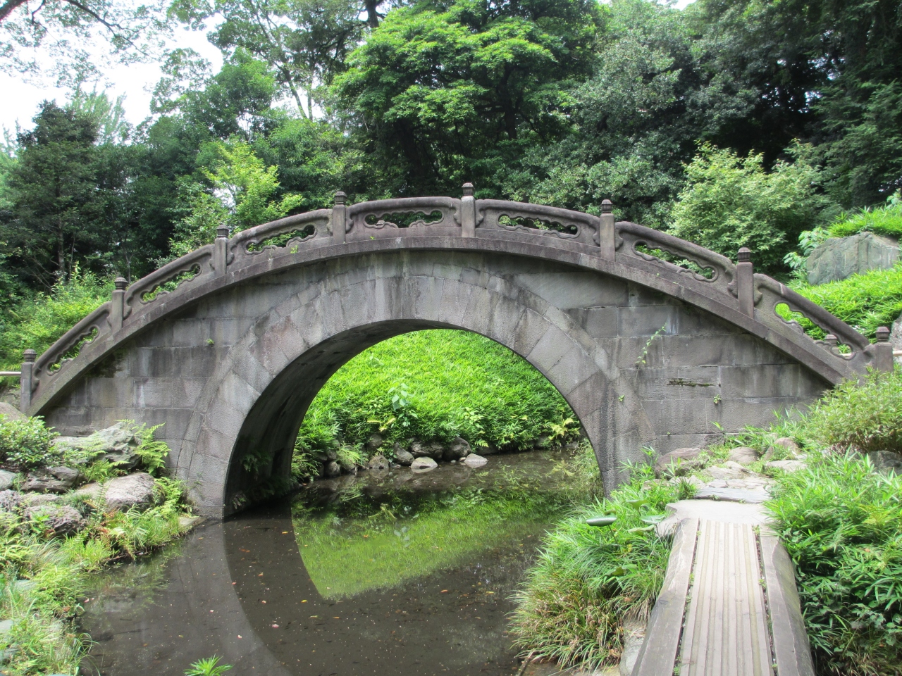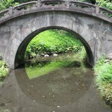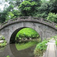 中国の明時代の儒学者・朱舜水が指導、設計したといわれている橋で、橋の半円部分が水面に映り、満月のような円になることから名付けられました。完成以来、三回あった大地震にも崩れることがなかった強固な橋です。光の向きと見る方向によって、確かにまん丸に見えます。庭園完成当時から残る貴重な建物です。