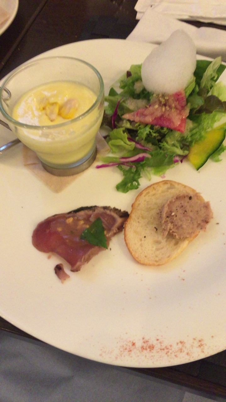 青葉台駅から徒歩7分程の18号沿いにあるイタリアン。前菜、パスタかピザ、デザート、ドリンクで1700円ほど、前菜はコーンスープ、鰹カルパッチョ、サラダ、豚のパテ、マルゲリータ、ティラミス、コーヒーにしました。