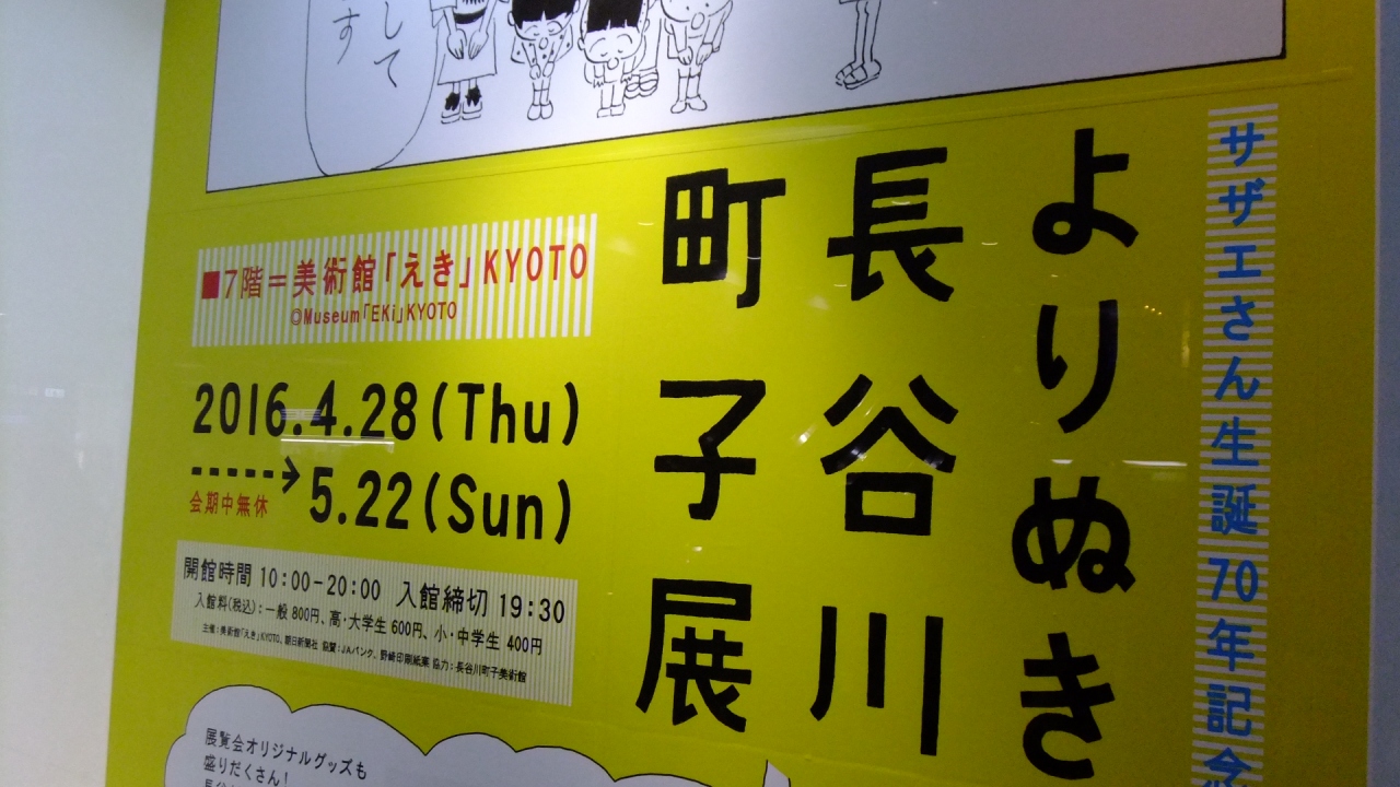 京都駅の伊勢丹の7階にある美術スペース。今回(2016年5月)は「よりぬき長谷川町子展」というものが開催されていました。この企画展は京都からスタートして、広島、東京、名古屋と回るそうで、サザエさん70周年の企画とのことでした。