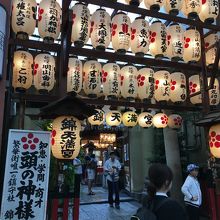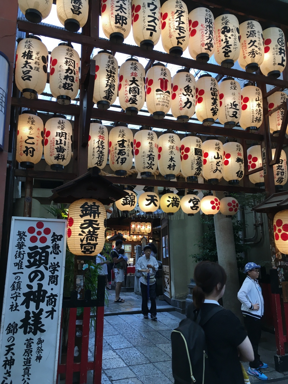 商店街の中にある立地の良い神社。天満宮だけあって、菅原道真公を祀っているので、狛牛がいます。鋳造されているものなので、たくさんのひとに触られたのでしょう。場所によって色がちがっています。提灯の装飾もあるので、外国人観光客もたくさんいます。