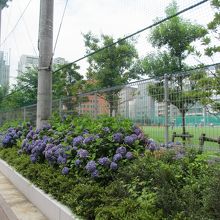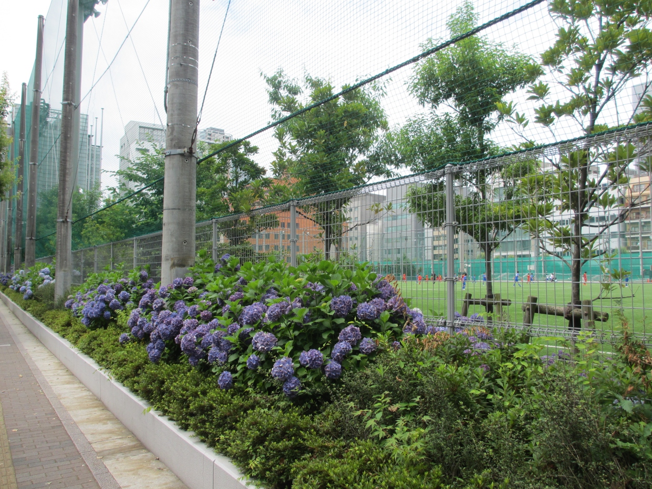 水道橋駅から後楽緑道を通って小石川後楽園へ向かいました。小石川後楽園入口の前にある運動場です。日曜午前に訪れた時は人工芝の運動場はサッカーコートとして利用され試合が行われてました。運動場を利用するには登録手続きをしてから申し込みをします。サッカー、野球、ソフトボールなどの競技に利用されてます。夜間照明設備もあり午後8時半まで利用することができます。小石川後楽園側のフェンス沿いにアジサイが植えられていてきれいに咲いてました。十数年前に近くの高校の体育祭で訪れた時は土のグランドでした。今は当時と比べ、整備され整然とした運動場に変わっていて時の流れを感じました。
