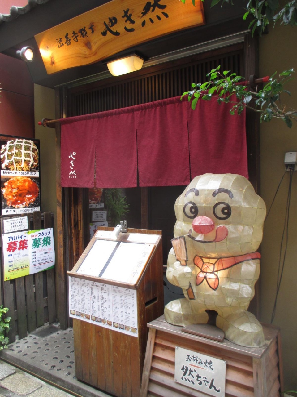 法善寺横丁にあります。これがやき然さんのキャラクターなのかというゆるキャラが入口にあるのですぐにわかります。1000円のモダン焼きをいただきました。グルメの中心と言われる法善寺横丁にあるだけあってフワフワ感が文句なしでした。