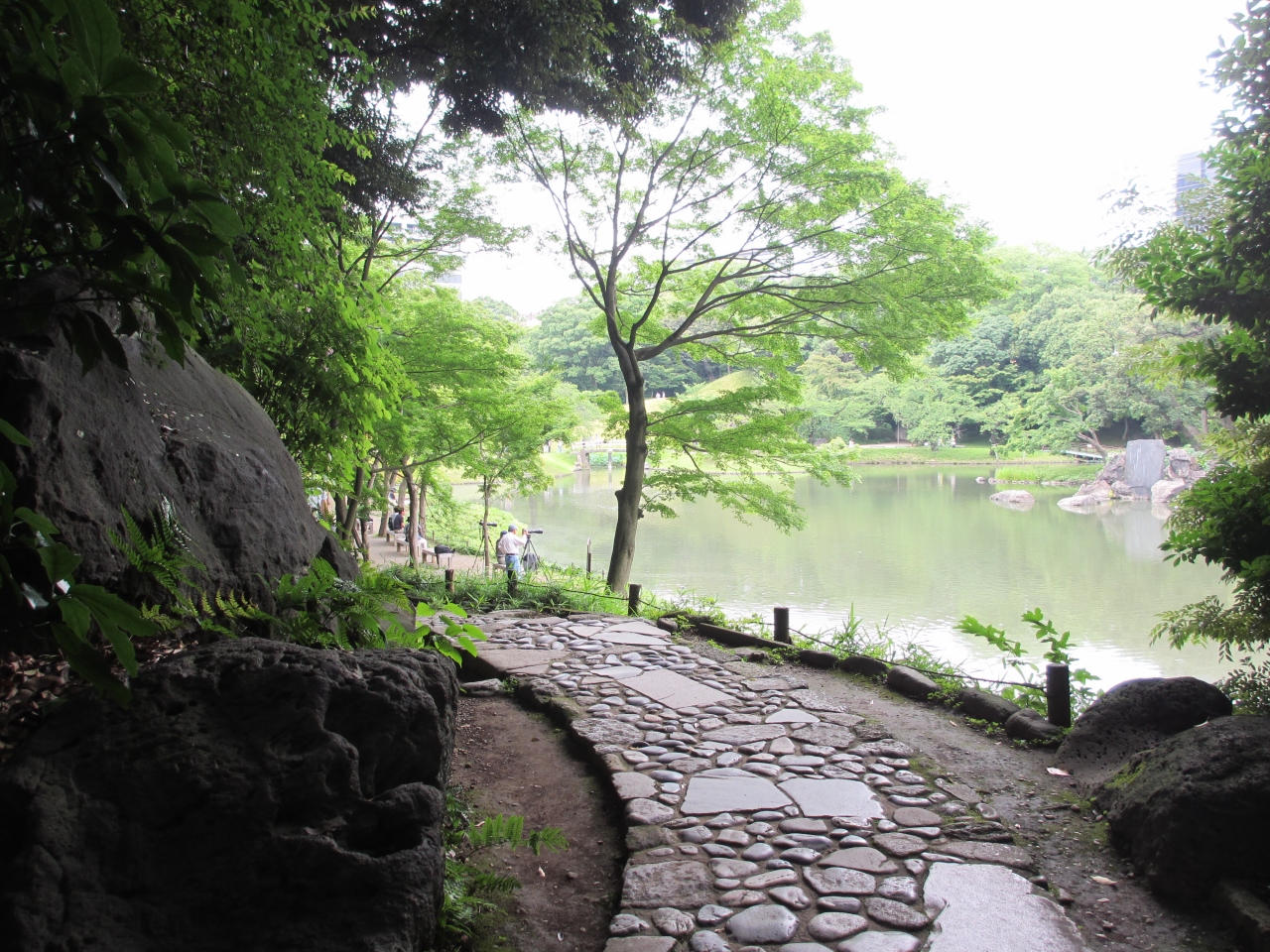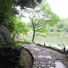 現在の小石川後楽園は水戸藩上屋敷に隣接した庭園でした。東京ドームがある所に上屋敷があり、客人を上屋敷から唐門跡にあった唐門から庭園へ招きます。江戸から木曽路を通り京都へいざなうイメージで庭園が造られました。木々が生い茂った木曽路を通る石畳が延段です。緩やかなカーブの石畳は中国式で大小の自然石と切石を組み合わせたものです。延段の左右には寝覚の床にちなんだ寝覚の滝やシュロが多く植えられていた木曽山があります。延段を進んでいくと視界が広がり、大泉水が現れ開放的な印象を受けます。