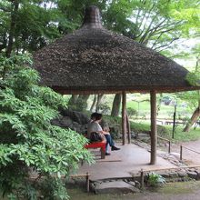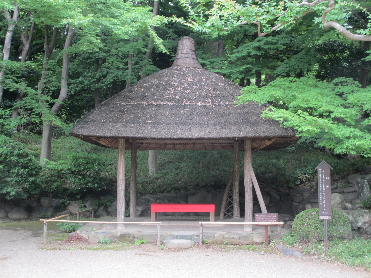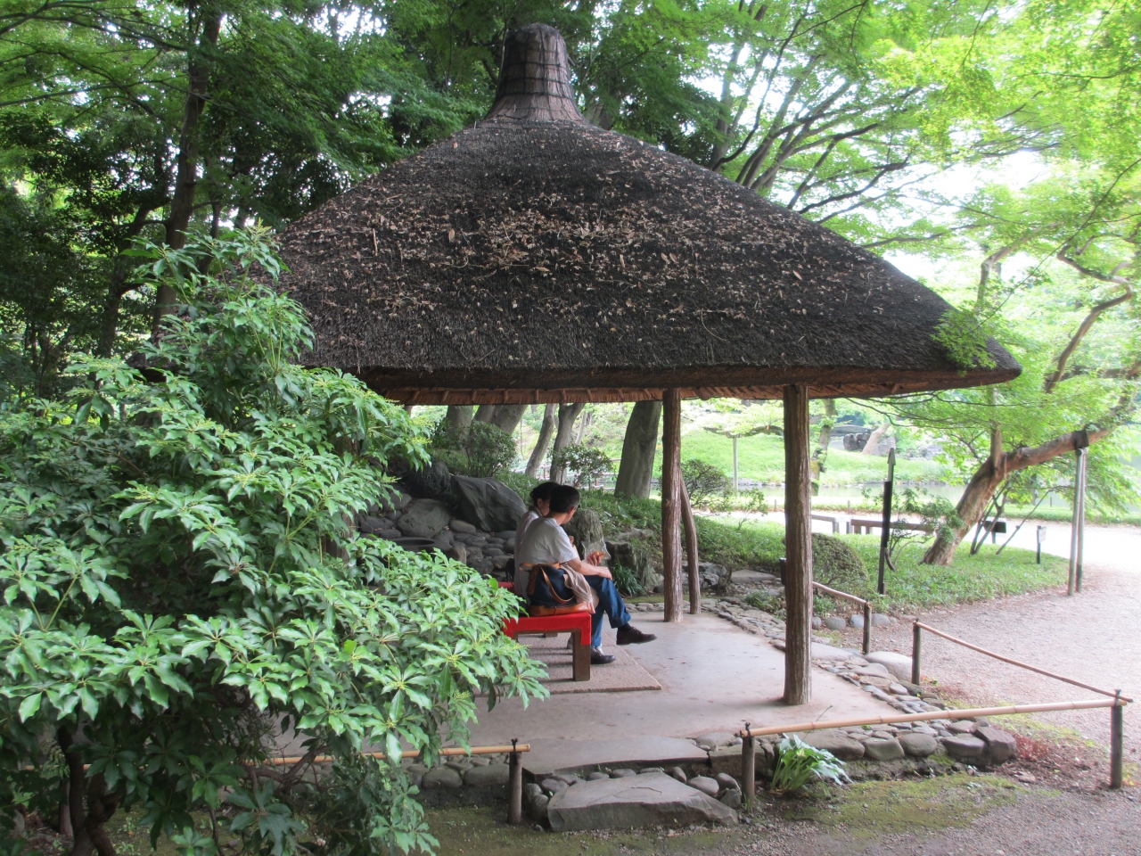小石川後楽園の大泉水のそばにある休憩所です。小石川後楽園は水戸藩上屋敷に隣接した庭園で、上屋敷から木曽路を通り琵琶湖に出て京都へ入るイメージで造られた庭園です。大泉水は琵琶湖を模していて、唐崎の一つ松にちなんだ美しい松を丸屋から眺めることができます。昔の田舎の茶屋のたたずまいを模した丸屋は水戸藩主や徳川将軍が休んだところです。戦災で焼失しましたが、1966年に復元されました。散策途中で休憩する人が後を絶ちませんでした。屋根に目立たぬよう網がかけられているのは、鳥が巣作りでわらを取るのを防ぐためだそうです。時代に応じた復元方法があるのだと気づかされました。