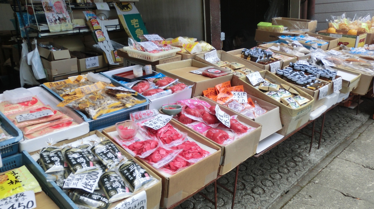 観光客向けのさるぼぼ関連といったものから、地元の農家のおばさんが作ったらしい野菜が少しずつ置かれているものまでいろいろです。