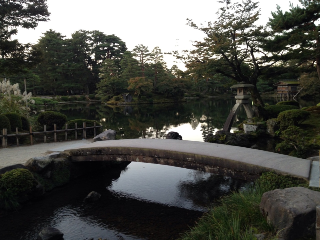 様々な木々の緑に囲まれた、兼六園で一番大きな池で存在感のある灯籠や日本の伝統的な亭が同時に視界に入り、まさに日本の三大名園を象徴する景色です。