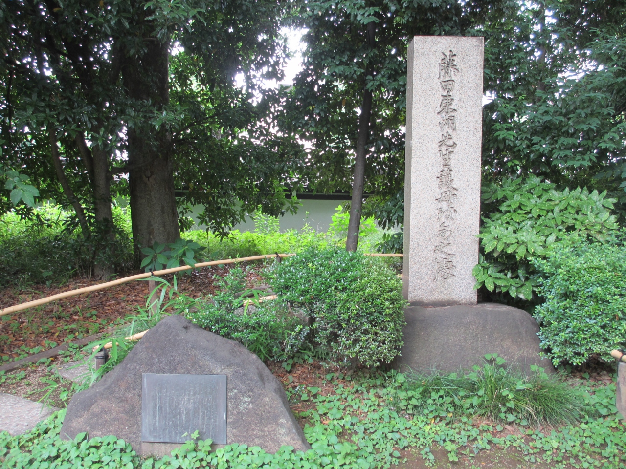 藤田東湖は江戸時代後期の水戸藩士で水戸学を全国に広めた儒学者です。安政の大地震の際、水戸藩上屋敷内の長屋で逃げ遅れた母を助けようとして倒壊した家屋の下で亡くなりました。水戸藩の人々は突然の死を惜しみ、長屋のあった所に石碑が建てられました。白山通りの拡張工事のため長屋のあった所はなくなり、小石川後楽園に移設されました。梅林の奥の木々の中に立ってます。小石川後楽園は水戸藩上屋敷に隣接した藩の庭園でした。藤田東湖の業績と母を思う心が後世にも伝えられ大切にされているからこそ後楽園に移されたのではないかと納得しました。ここの梅林には里帰りの梅も植えられています。故郷の水戸に似た梅林の奥に移した人々の気持ちも温かいと感じました。