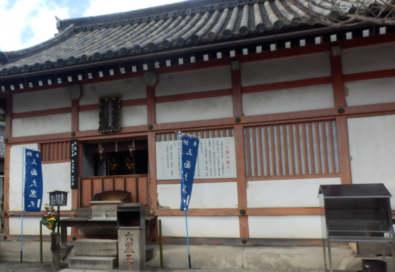 東寺(教王護国寺)JR京都駅から徒歩15分にあるお寺、正式名は東寺真言宗総本山教王護国寺、境内毘沙門堂の西側にある大黒堂には、大黒天、毘沙門天、弁財天の三尊が合体した三面大黒天が祀られています、お大師さまが造られたとされています、東寺境内の多数あるお堂の中ではやや小ぶりではあるが参詣者が一番身近に感じられるお堂と思えます京都の観光地はいずれも混雑していますが京都駅南側にある東寺は信仰の場として静寂さが保たれています