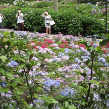 寺の山内にある広い庭園には、約10,000株ものアジサイが植えられており、青、白、ピンクなど、イロトリドリの花が目を楽しませてくれます。